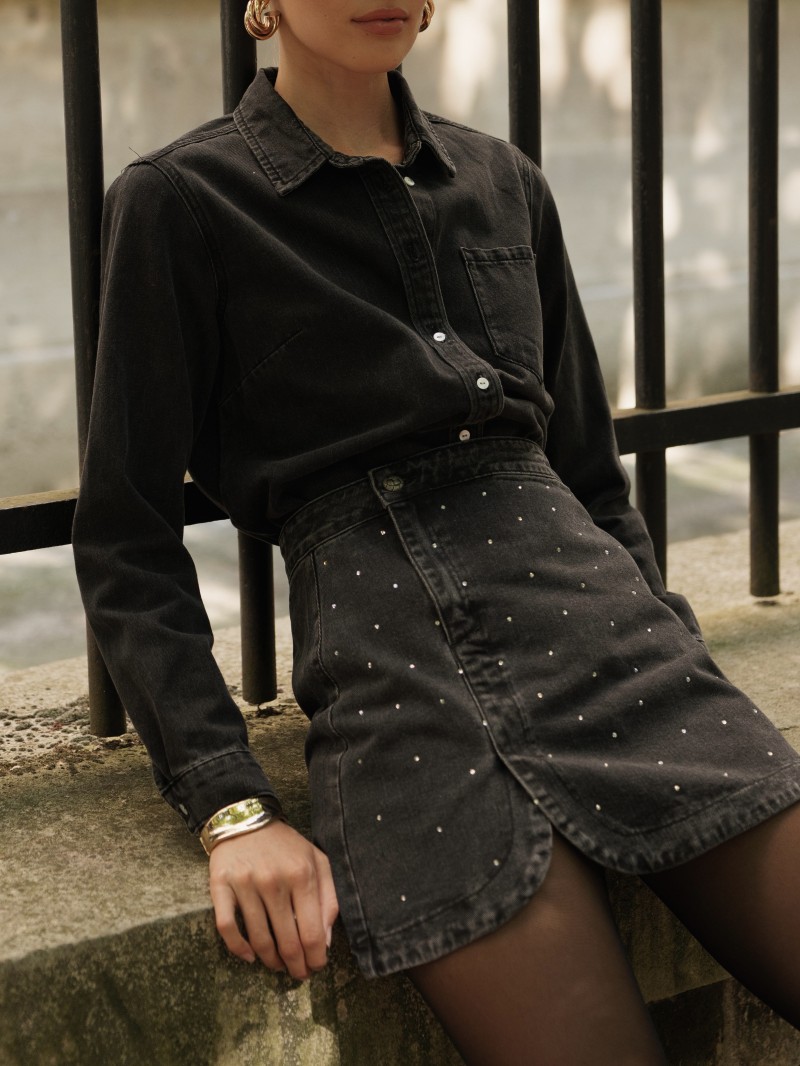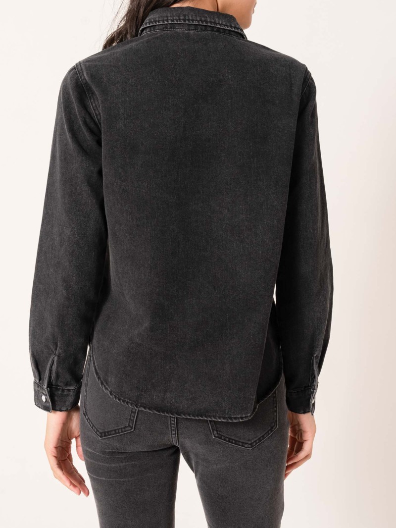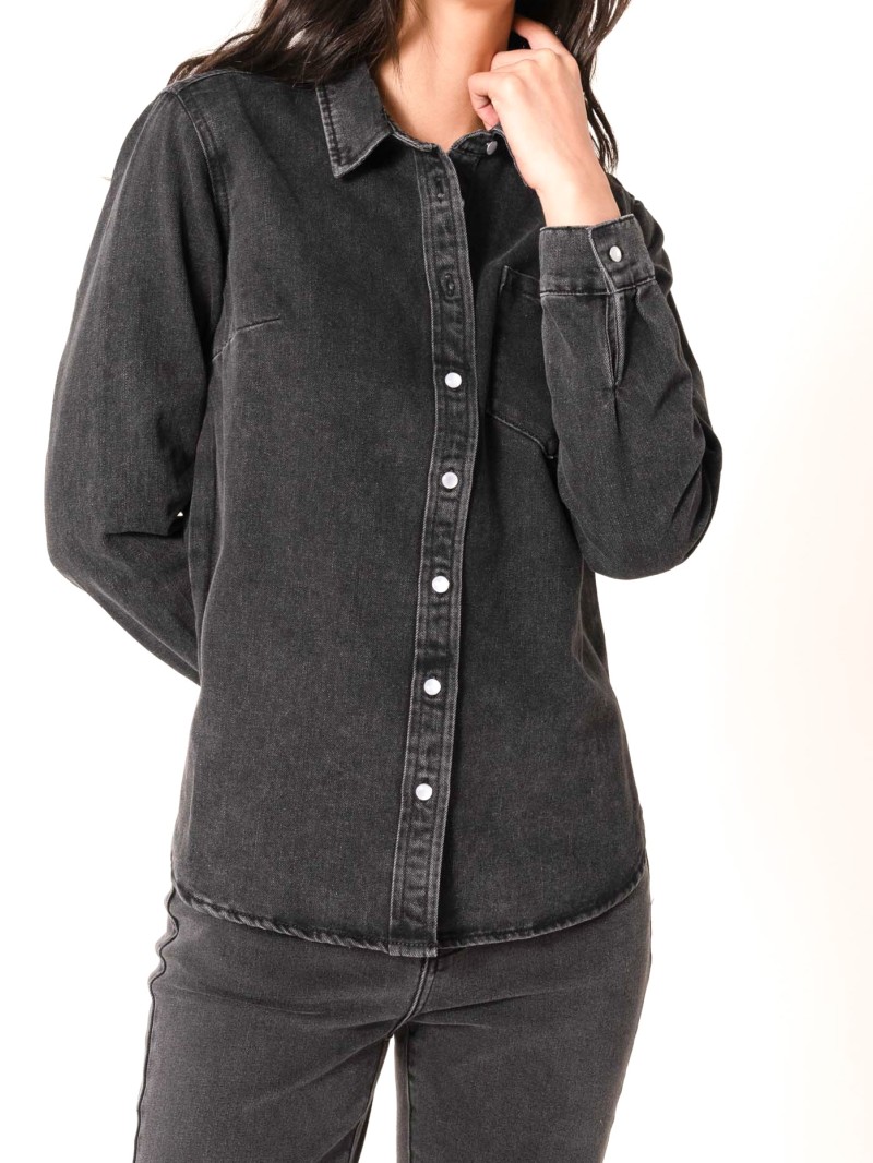 - Style: Gerades Jeanshemd mit Perlmuttknöpfen.