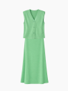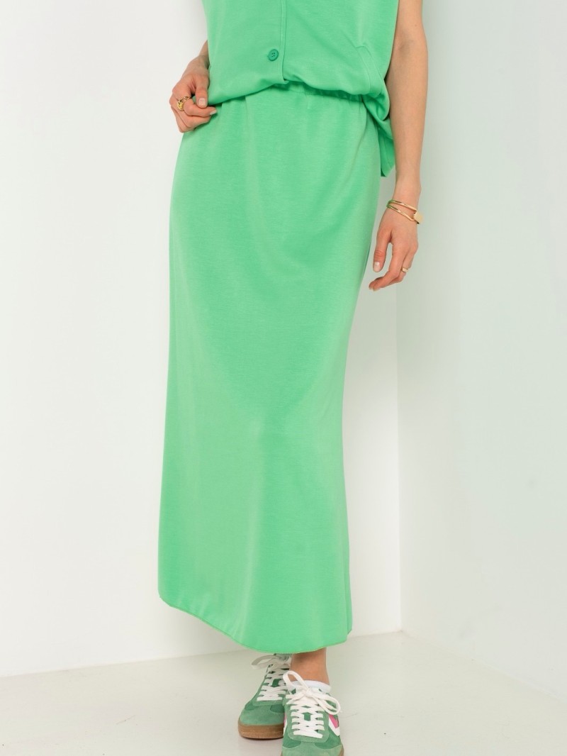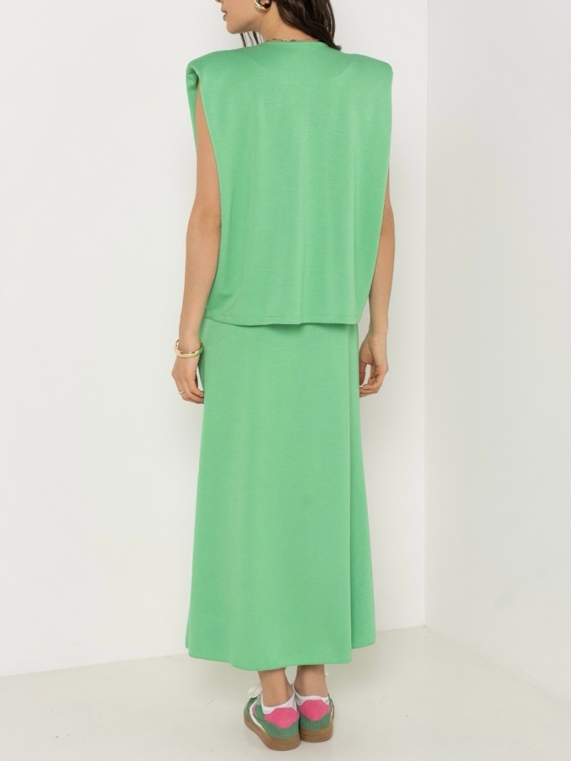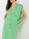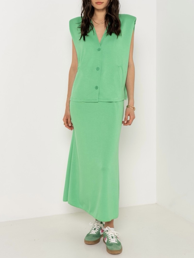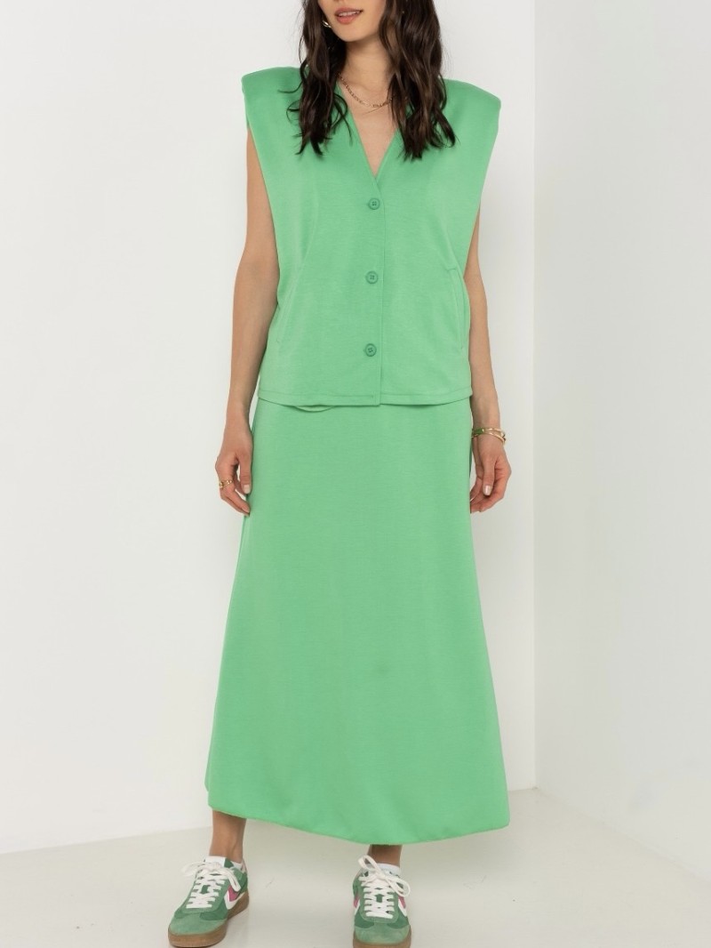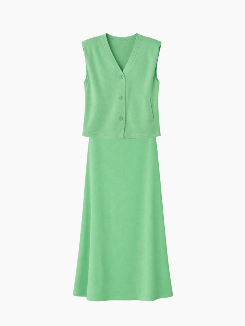 Dieses zweiteilige Set in leuchtendem Grasgrün vereint Komfort und Eleganz mit seiner ärmellosen Weste zum Knöpfen und seinem fließenden Rock mit elastischer Taille. Perfekt für einen frischen und strukturierten Look im Alltag.