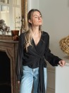 Diese elegante, fließende Wickelbluse betont die Silhouette dank der Schleife an der Taille. Die leicht transparenten Ärmel und der raffinierte Fall machen sie zu einem femininen und zeitlosen Kleidungsstück.