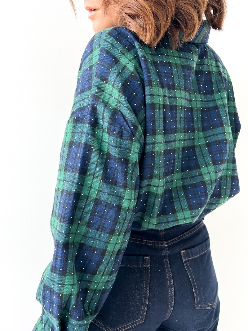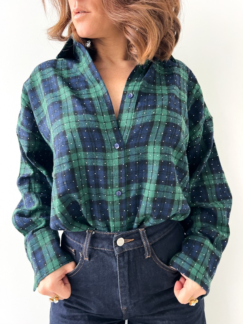 Ein fließendes, modernes Hemd mit grünem und blauem Karomuster, das mit feinen Paillettenakzenten für einen trendigen Look aufgepeppt wurde. Der leichte und bequeme Schnitt macht es zu einem idealen Stück für einen lässigen, aber selbstbewussten Stil.