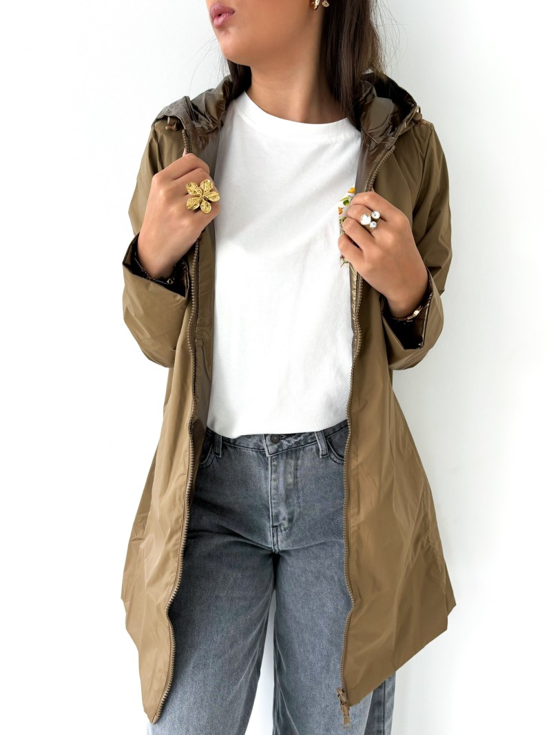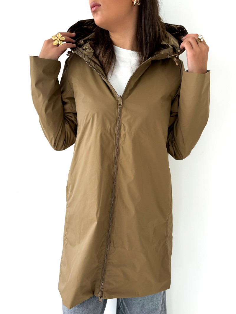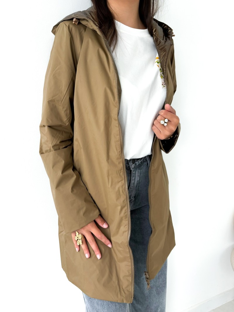 Lange, wattierte und wendbare Regenjacke für die Übergangszeit