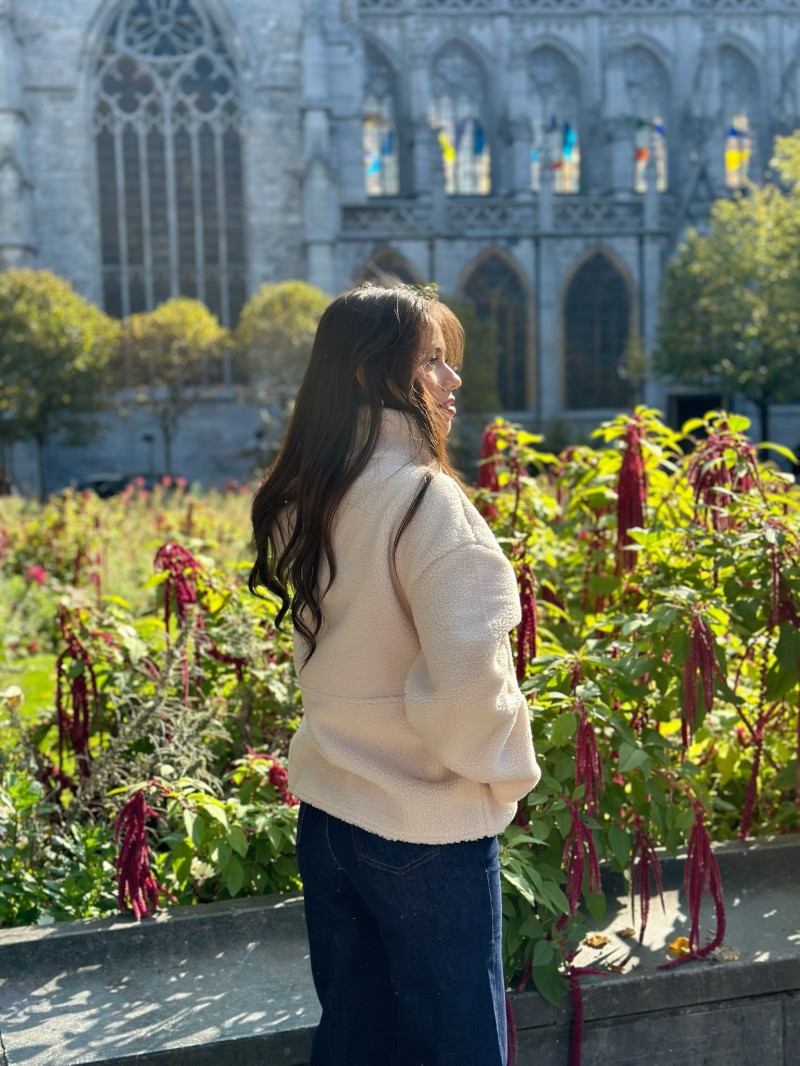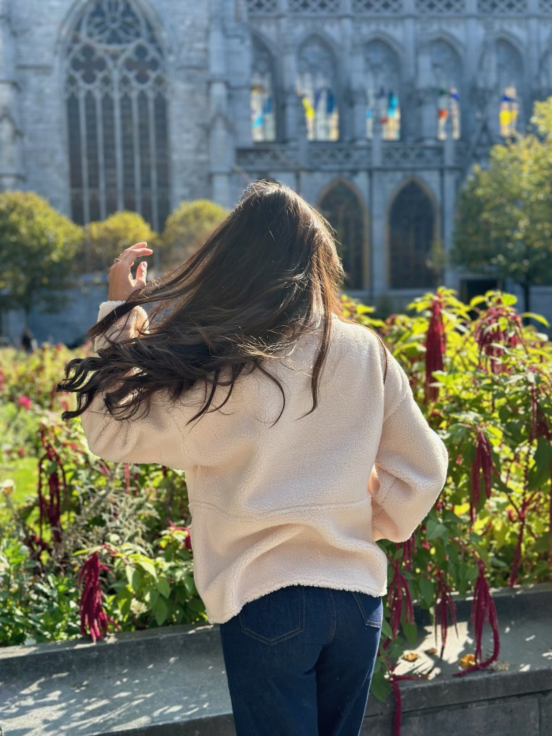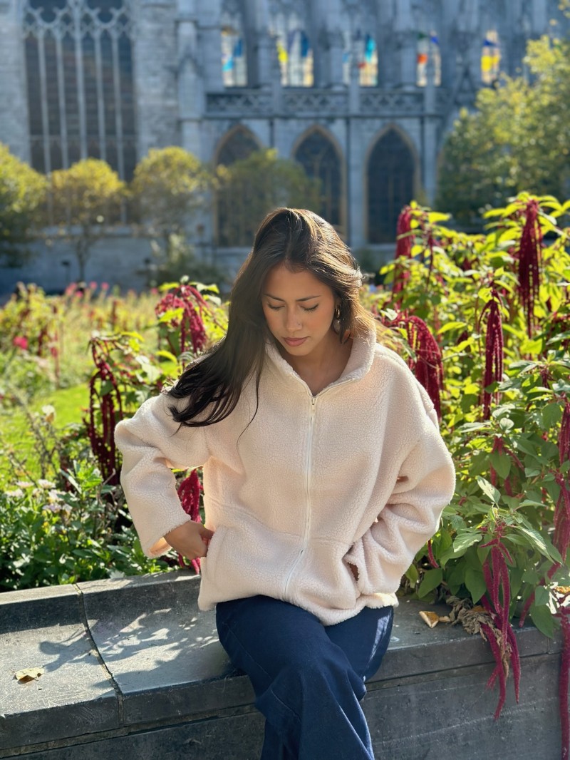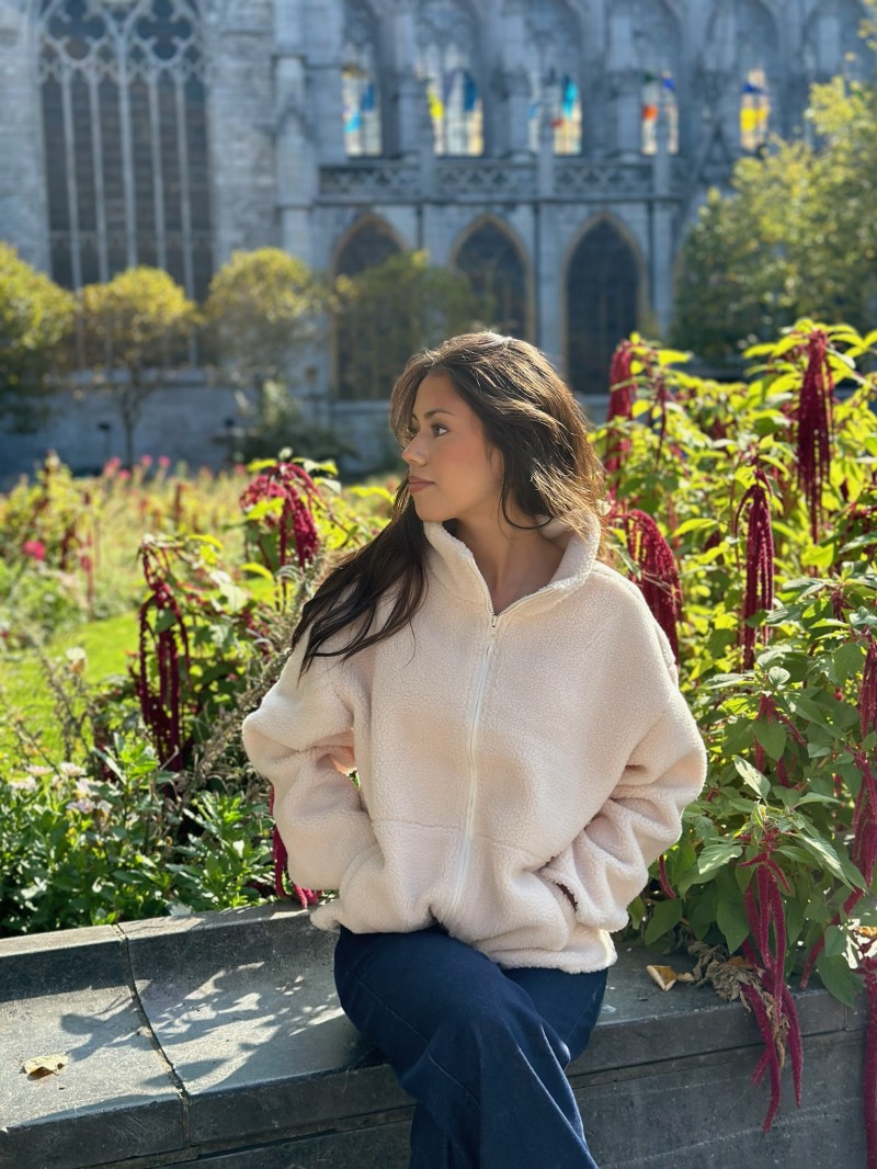 Die warme und trendige Jacke Teddy Douce ist der perfekte Begleiter, um kühle Tage stilvoll zu überstehen. Ihre Schafsfelloptik sorgt für Komfort und Modernität, egal ob Sie sie zu einer lässigen Jeans oder einem eleganteren Look tragen.