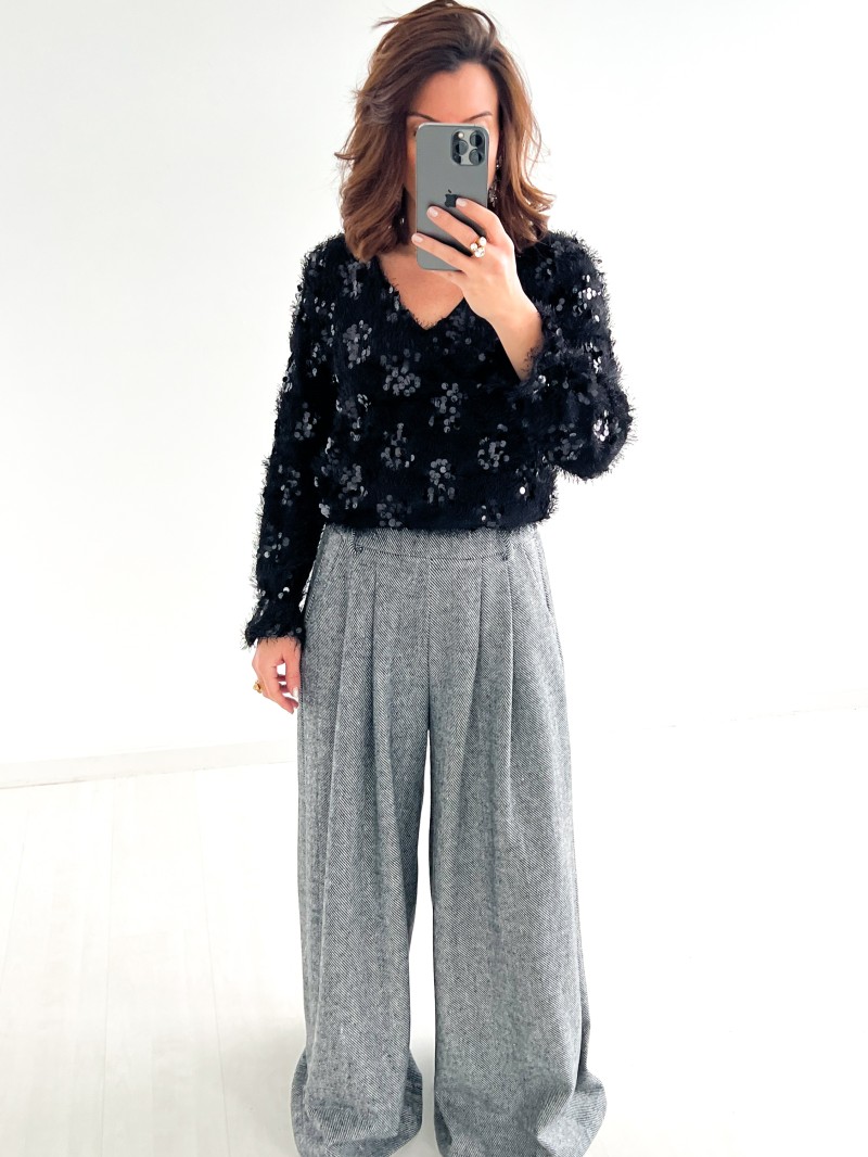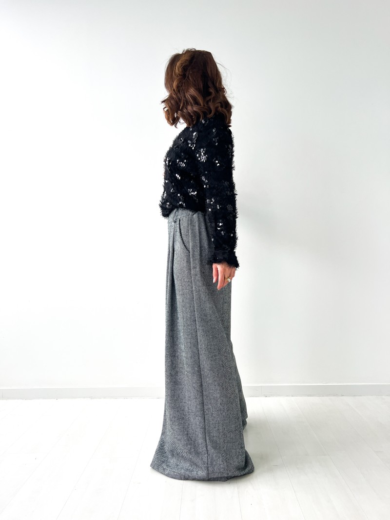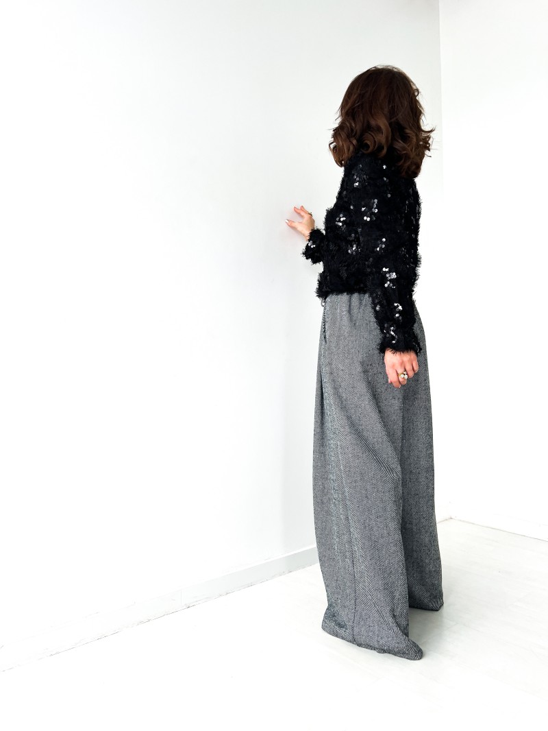 Eine weite, fließende Hose im modernen Stil, die aus einem weichen, bequemen Material gearbeitet ist. Der lockere Schnitt und der elegante Fall strecken die Silhouette, während der elastische Bund für ein absolut bequemes Tragegefühl sorgt. Ein modisches und leicht zu tragendes Stück, das mühelos schick aussieht.