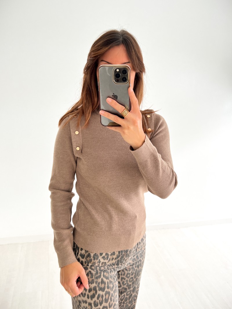 Das Design aus Feinstrick wird durch dekorative goldene Knöpfe an den Schultern hervorgehoben, die dem Schnitt eine elegante Note verleihen. Aus einem weichen, bequemen Synthetikmaterial gefertigt, bietet es Wärme, Stil und Komfort für jede Jahreszeit.