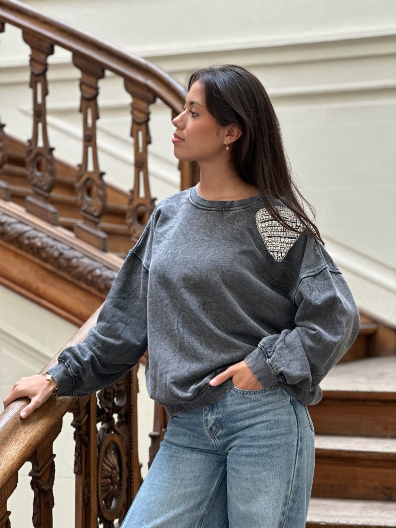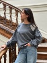 Ein Sweatshirt im Casual-Stil mit einem unerwarteten Hauch von Glamour. Der Oversize-Schnitt und die weiche Baumwolle machen es zu einem bequemen Kleidungsstück, während die mit einer strassbesetzten Maxi-Schleife verzierte Schulterpartie alle Blicke auf sich zieht. Ein gewagter Kontrast zwischen Lässigkeit und Glanz.