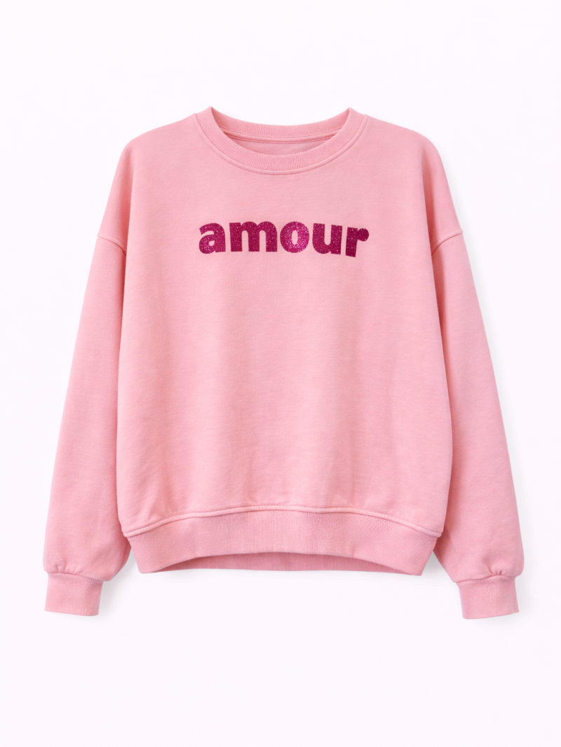 Bequemes Oversize-Sweatshirt mit glitzernder „Amour“-Aufschrift auf der Vorderseite.