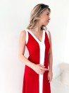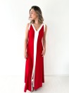 Ein fließendes, perfekt fallendes langes Kleid mit hübschen Kontrasteinsätzen. Sein strukturierter Stoff ist von diskreten vertikalen Linien durchzogen, die für Relief und Eleganz sorgen. Der V-Ausschnitt und der Schlitz an der Seite strecken die Silhouette dezent.