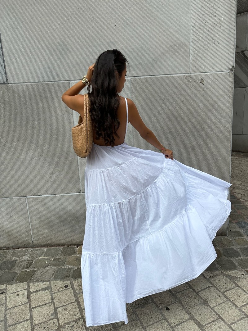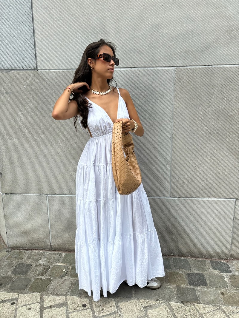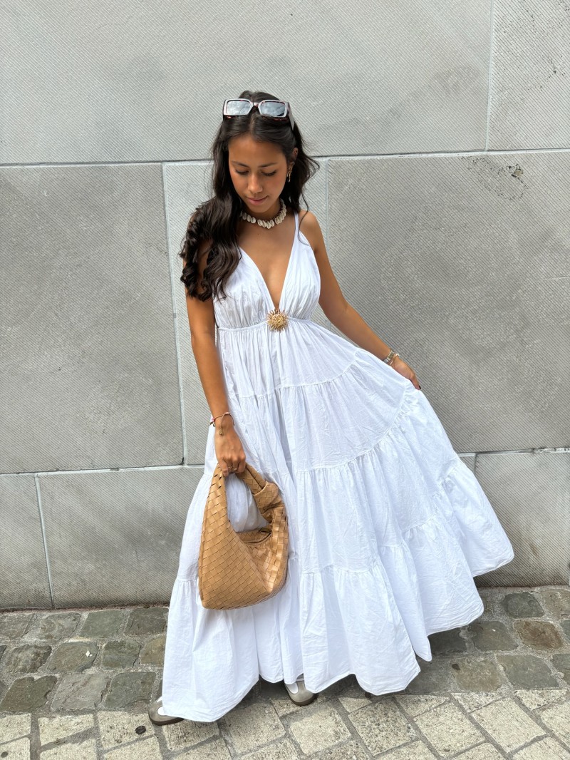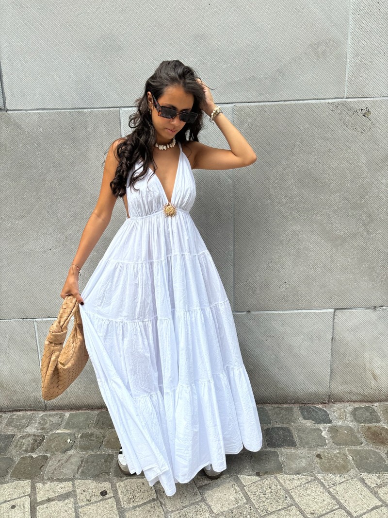 Langes Kleid mit schmalen Trägern, einem eleganten Kreuzausschnitt und einer Taille, die durch ein goldenes Medaillon in Form einer Sonne markiert wird. Sein weicher, leichter Stoff fällt in breiten Volants und sorgt für einen fließenden, sommerlichen Look.
