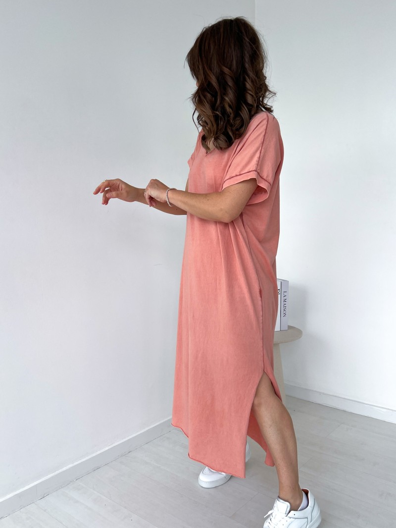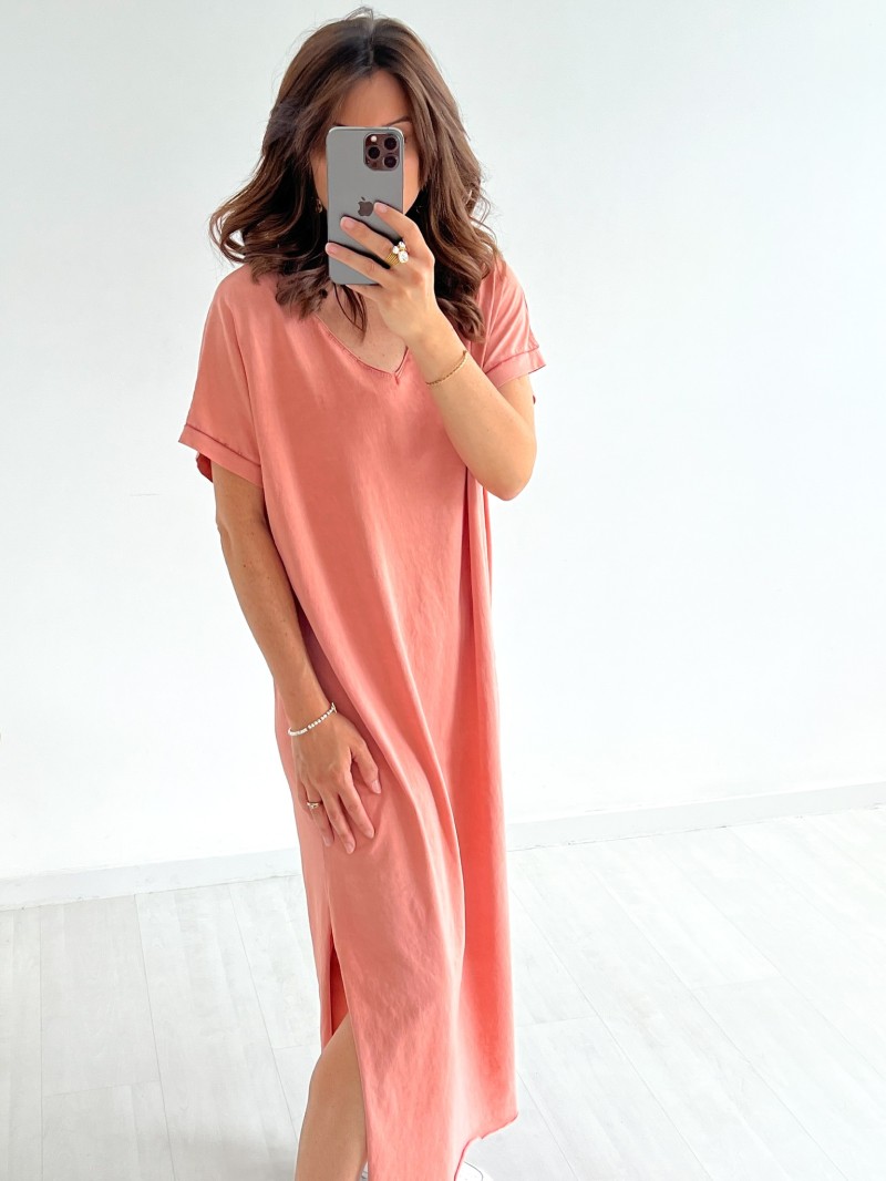 Ein fließendes Kleid mit V-Ausschnitt, das lässig und bequem geschnitten ist. Perfekt für sonnige Tage, lässt es sich auch im Alltag leicht tragen.