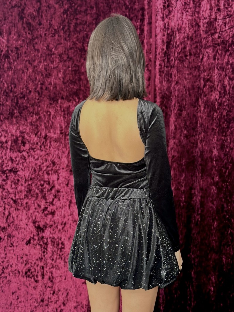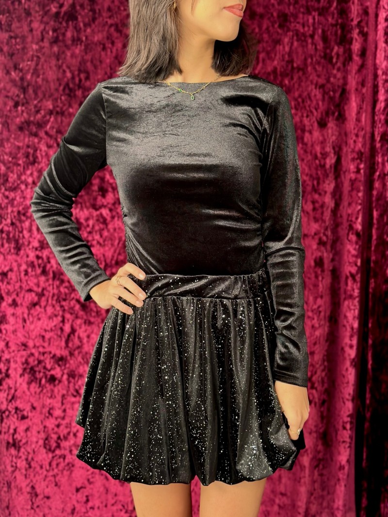 Dieser kurze schwarze Rock mit kleinen Glitzersteinen ist perfekt, um ein Abendoutfit aufzupeppen oder einem schlichten Look einen festlichen Touch zu verleihen. Das weiche, fließende Material verleiht ihm einen eleganten Fall, während er gleichzeitig sehr bequem ist.