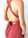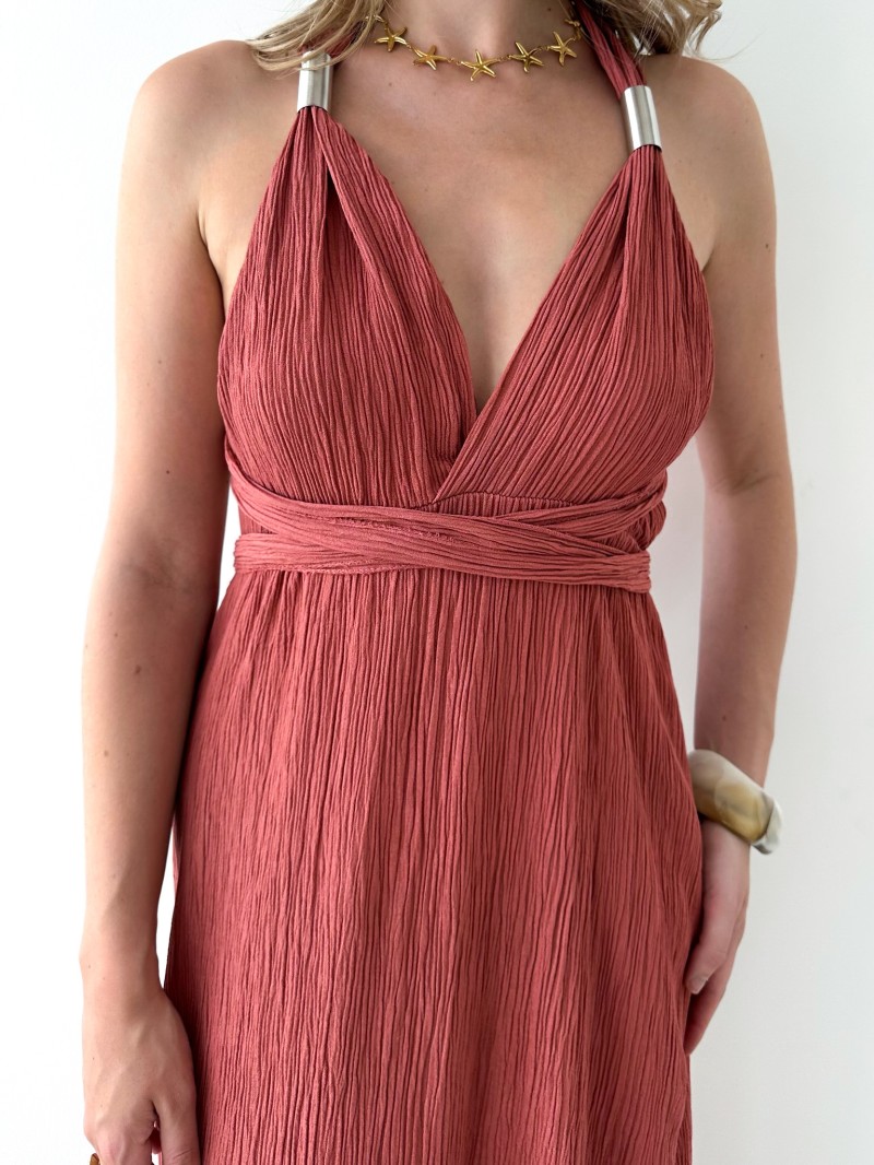 Langes, fließendes Kleid mit tiefem Ausschnitt, das die Silhouette betont. Der Rücken kann je nach Wunsch auf verschiedene Arten gebunden werden. Die silbernen Details an beiden Seiten der Träger verleihen dem Kleid einen dezenten, schicken Touch.