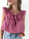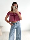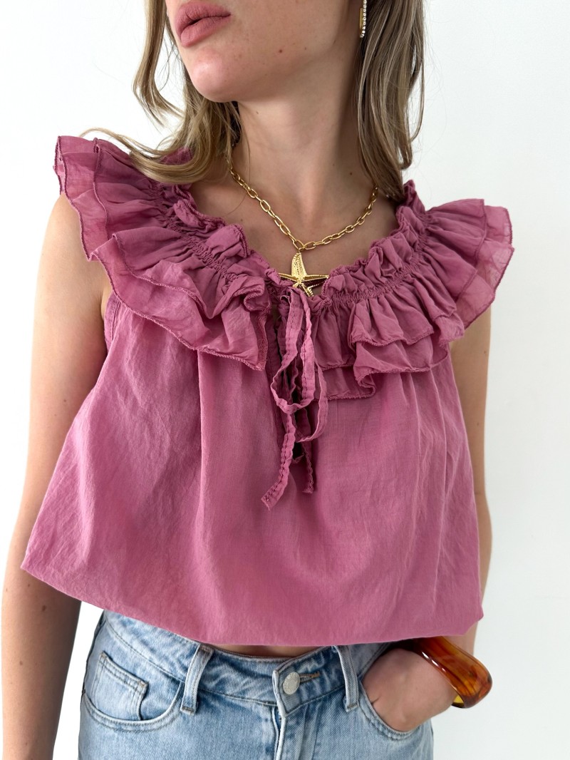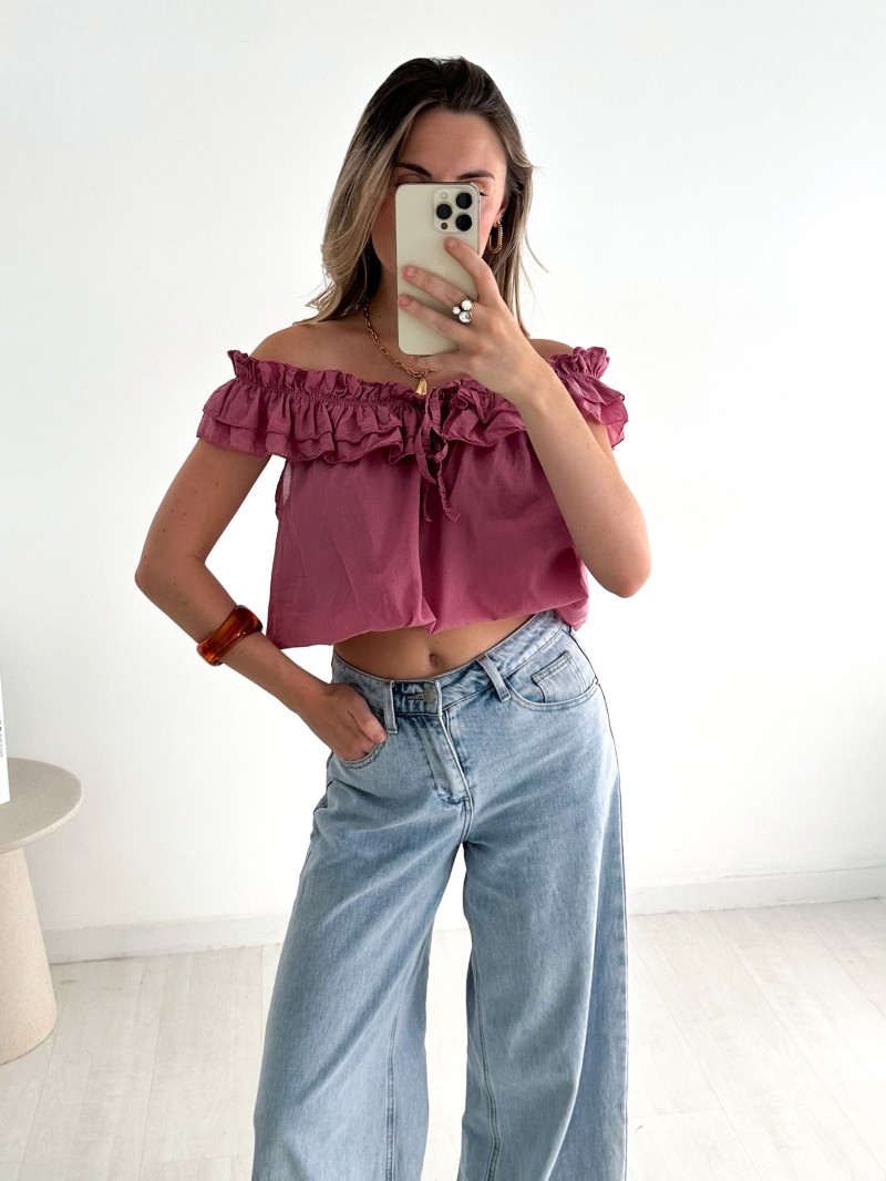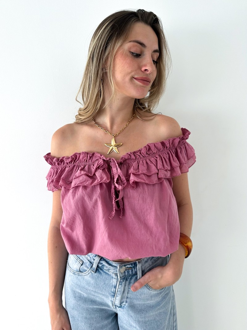 Das Top Rosa setzt mit seinem Bardot-Ausschnitt und den zarten Rüschen ganz auf Weiblichkeit. Es besteht aus 100 % leichter und atmungsaktiver Baumwolle und eignet sich sowohl für einen lässigen Look am Tag als auch für einen eleganteren Look am Abend. Ein garantierter Favorit für sonnige Tage!