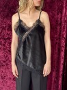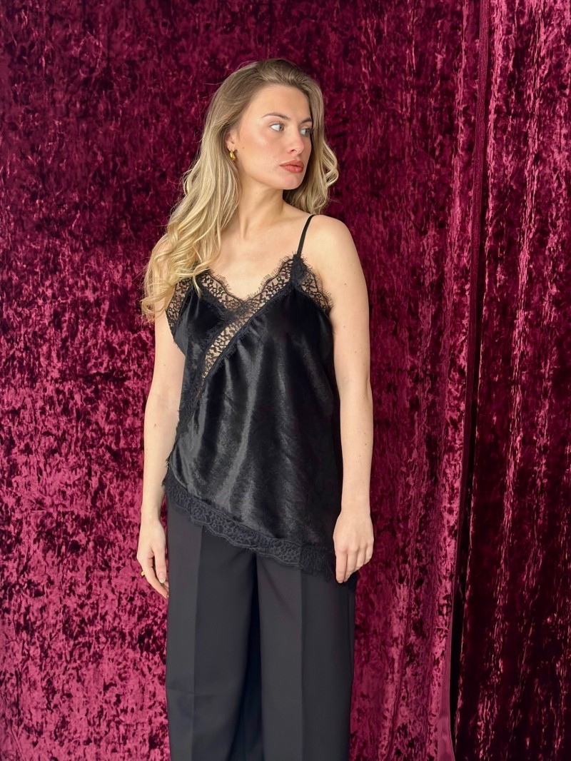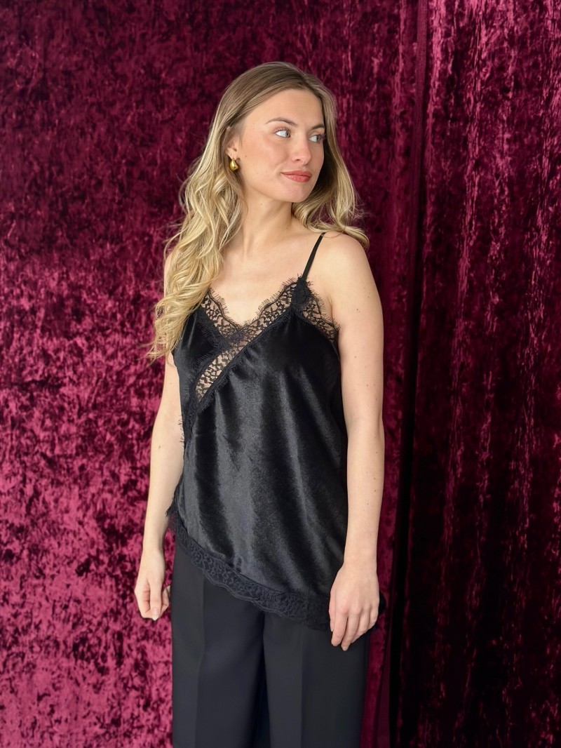 Ein feminines und zartes Unterhemd aus weichem Samt und raffinierter Spitze. Der dezent betonte Ausschnitt und der fließende Stoff machen es zu einem idealen Kleidungsstück, das Ihre Outfits allein oder unter einem Blazer perfekt ergänzt.