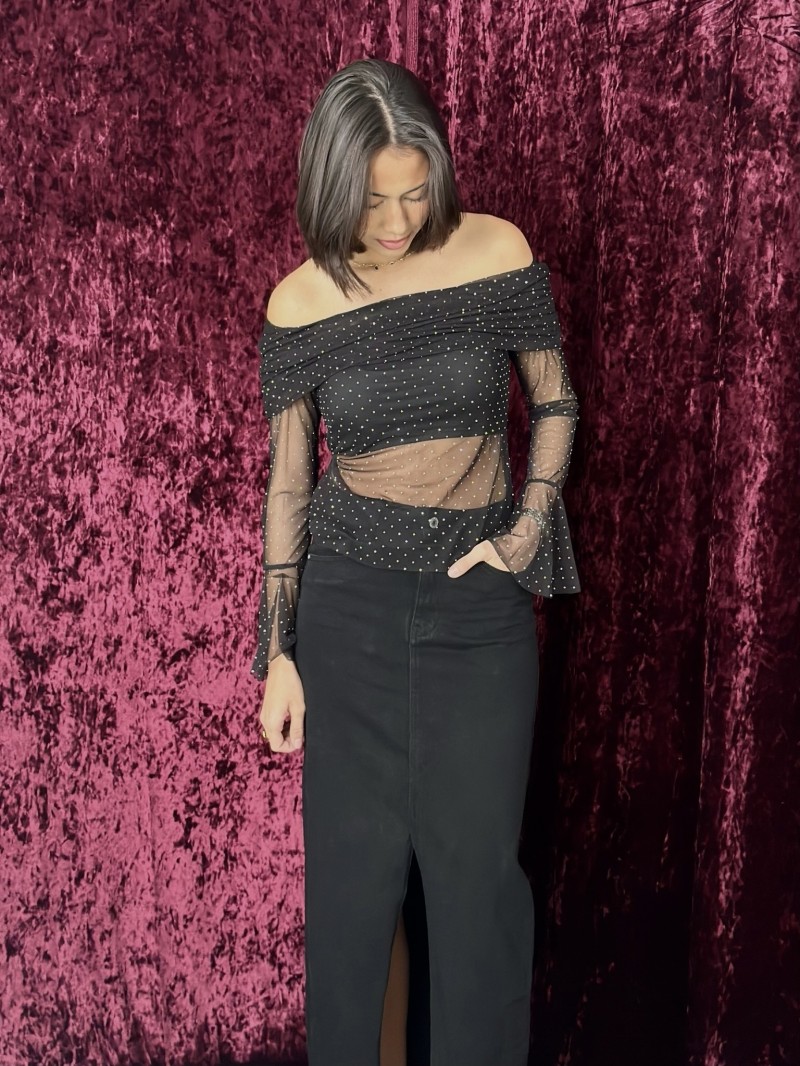 Le haut Anaïs est une pièce délicate et élégante, pensée pour sublimer vos tenues avec légèreté. Son voile noir agrémenté de petits pois scintillants apporte une touche glamour tout en restant facile à associer. Idéal sous un blazer, avec un pantalon taille haute ou une jupe fluide.
