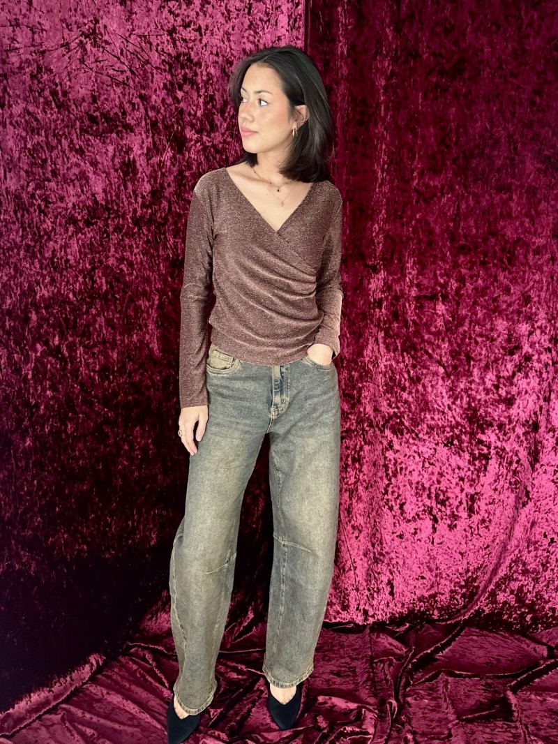 Un haut cache-cœur élégant aux reflets métallisés, parfait pour illuminer une tenue de soirée. Sa coupe croisée met en valeur la silhouette tout en restant confortable grâce à sa matière extensible.