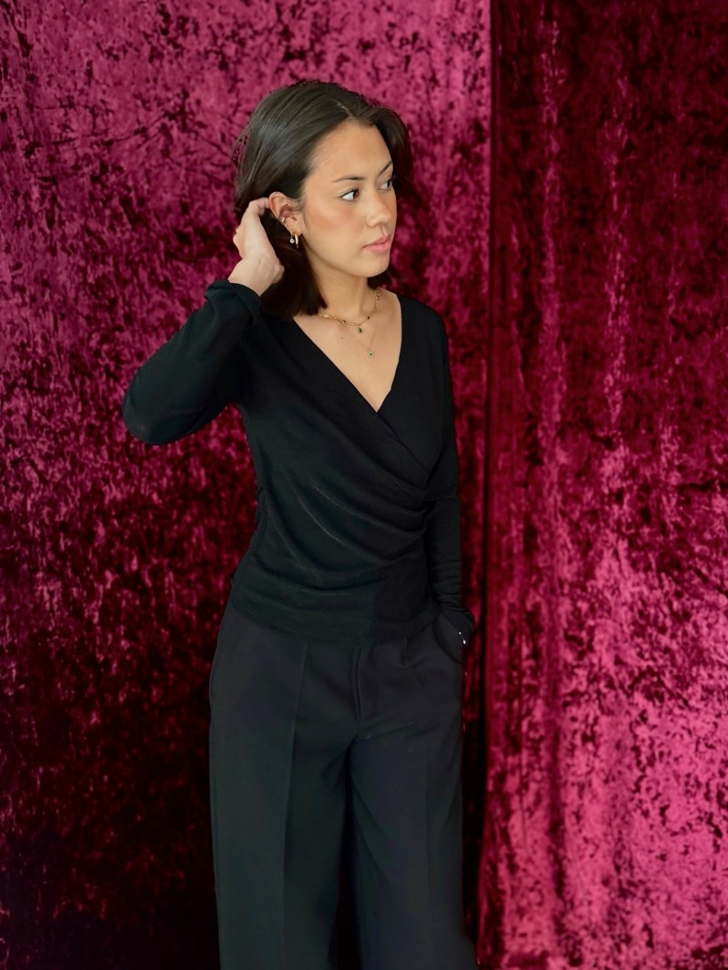 Un haut cache-cœur élégant aux reflets métallisés, parfait pour illuminer une tenue de soirée. Sa coupe croisée met en valeur la silhouette tout en restant confortable grâce à sa matière extensible.