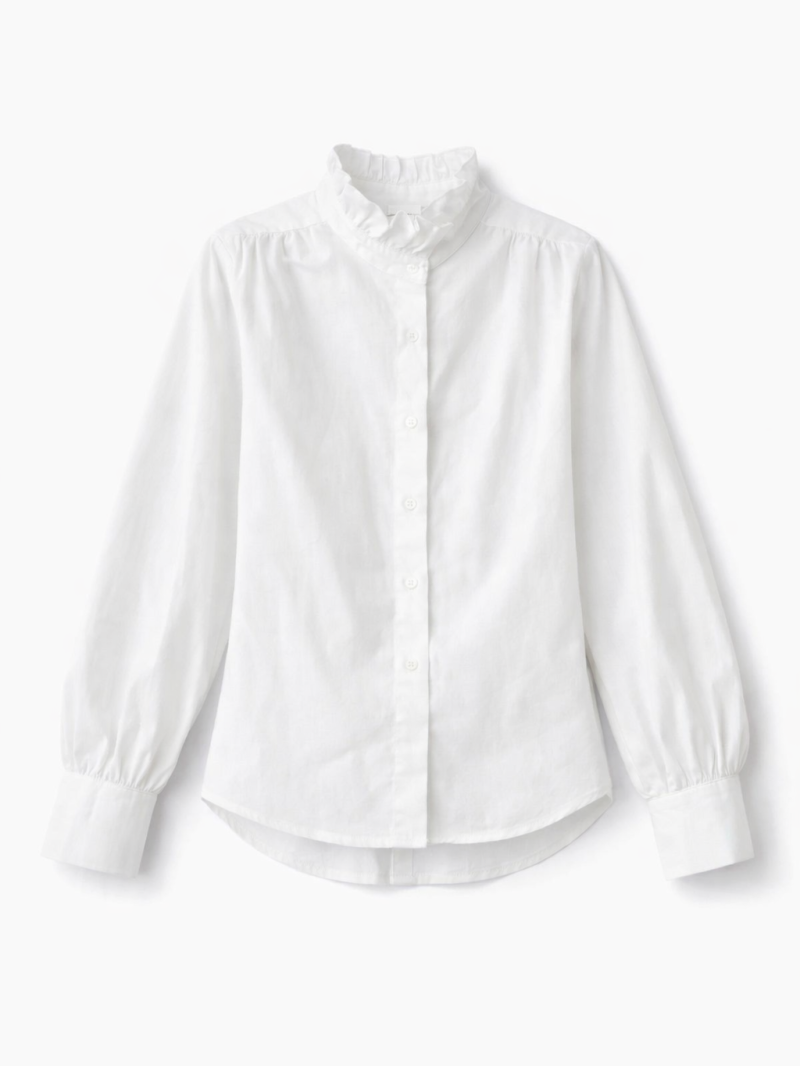 Chemise blanche intemporelle au charme délicat, sublimée par un col légèrement montant à volants et des manches longues aux poignets froncés. Une pièce élégante et féminine qui se porte aussi bien avec un jean qu’avec une jupe plus habillée.