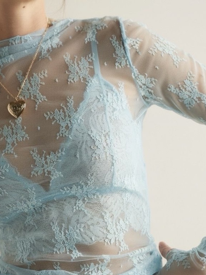 Blouse en dentelle délicate au style féminin et raffiné. Sa transparence subtile et ses finitions travaillées en font une pièce élégante, idéale pour habiller un look du quotidien comme une tenue plus habillée.