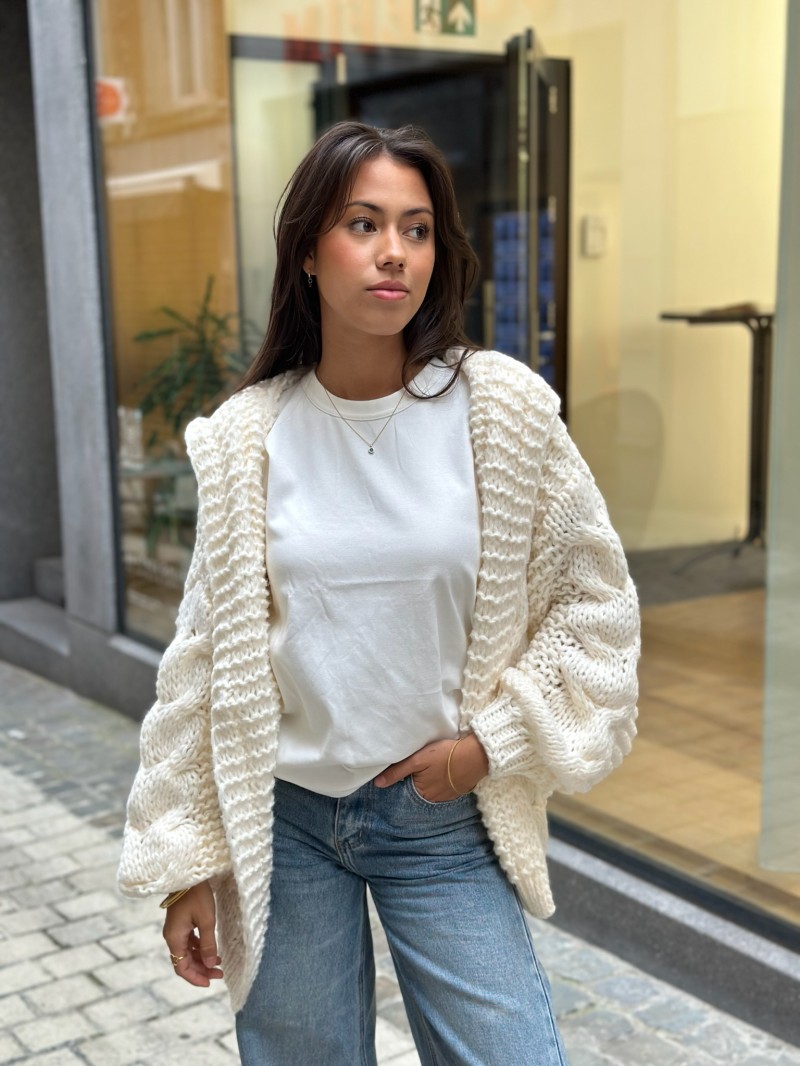 Un gilet cocooning à la maille généreuse et aux manches larges tressées. Sa capuche apporte une touche décontractée idéale pour les journées plus fraîches.