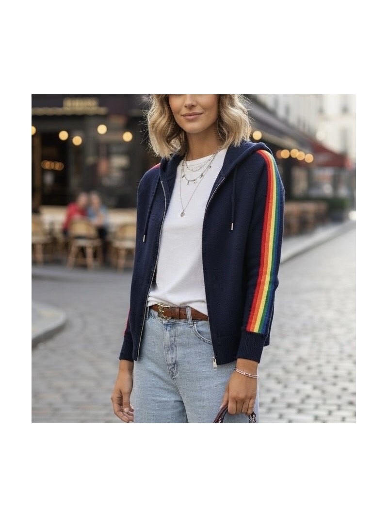 Gilet à zip au style casual et lumineux, rehaussé de bandes arc-en-ciel le long des manches. Une pièce facile à porter qui apporte une touche de couleur et de bonne humeur à une tenue simple.