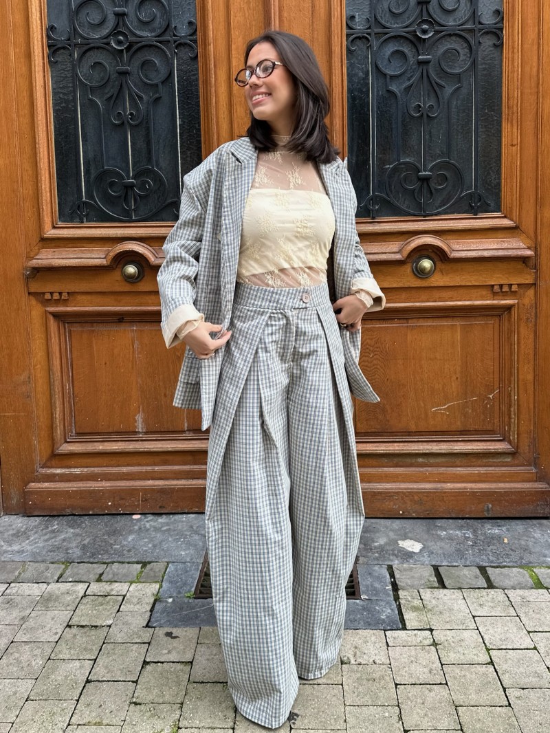 Pantalon à carreaux au tombé droit et élégant, avec taille haute structurée et pinces à l’avant. Une coupe fluide qui allonge la silhouette tout en restant confortable au quotidien.