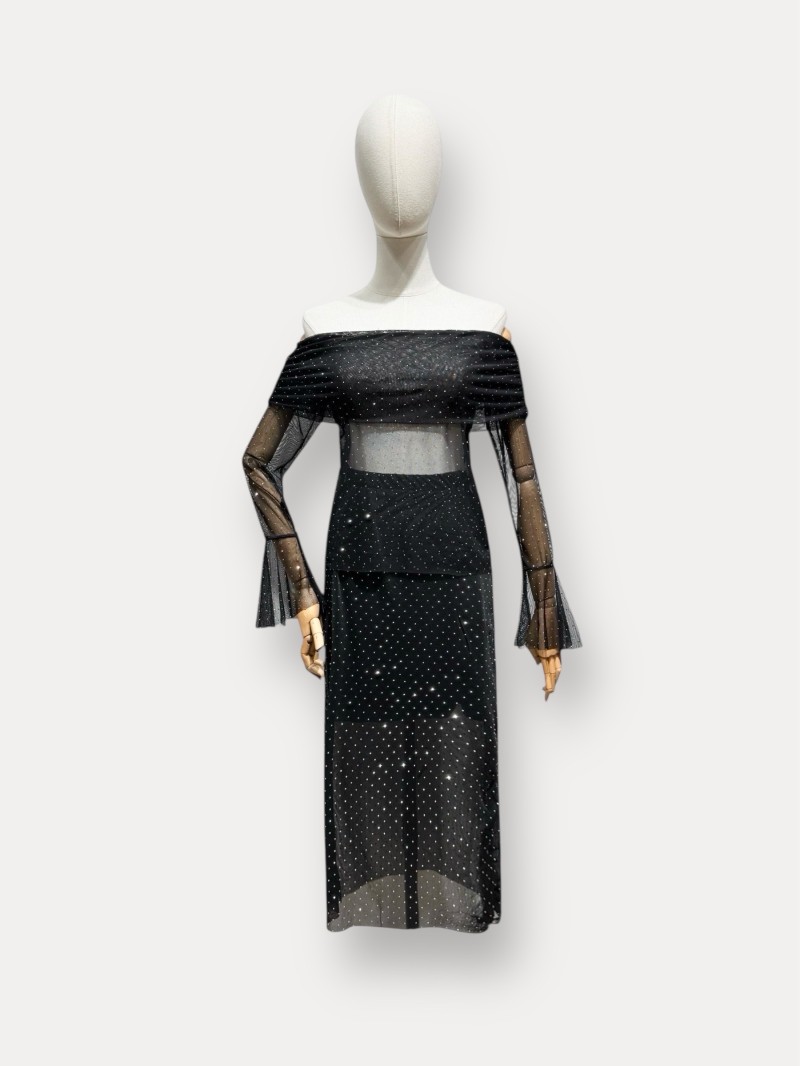 Jupe longue noire parée de délicats petits brillants, évoquant un ciel étoilé au crépuscule. Son voile transparent sur le bas lui donne une allure aérienne et raffinée, tout en gardant une belle fluidité. Sa taille élastiquée assure un confort parfait pour toutes les silhouettes. Une pièce élégante, facile à porter et idéale pour magnifier une tenue de soirée.