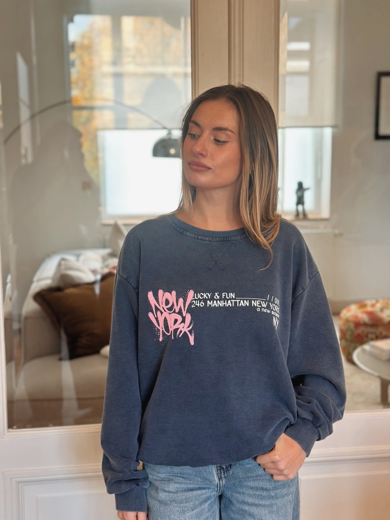 Un sweat au style urbain affirmé, avec une touche arty. L’imprimé “New York” façon graffiti, présent à l’avant comme à l’arrière, apporte une vraie énergie streetwear à cette pièce confortable et oversize. À enfiler pour affronter la ville avec style.