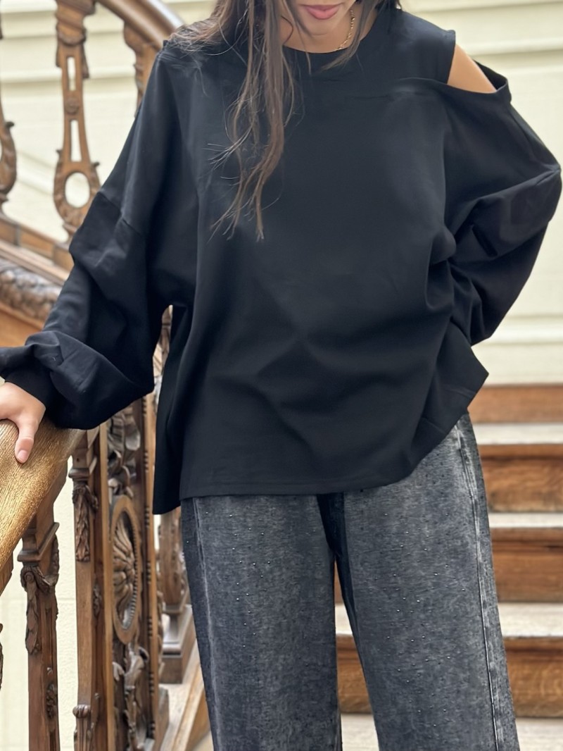 Le Nola est la pièce parfaite pour celles qui aiment les basiques revisités avec style. Mi-sweat, mi-t-shirt, il séduit par sa coupe oversize et son épaule ajourée qui apporte une touche d’asymétrie moderne et féminine. Confortable et original, il se porte aussi bien sur un jean que sur un pantalon habillé pour un look casual chic.