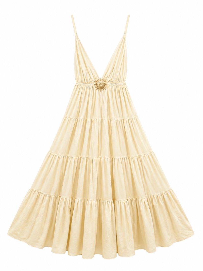 Robe longue à fines bretelles avec un décolleté croisé élégant et une taille marquée par un médaillon doré en forme de soleil. Son tissu doux et léger tombe en larges volants pour une allure fluide et estivale.