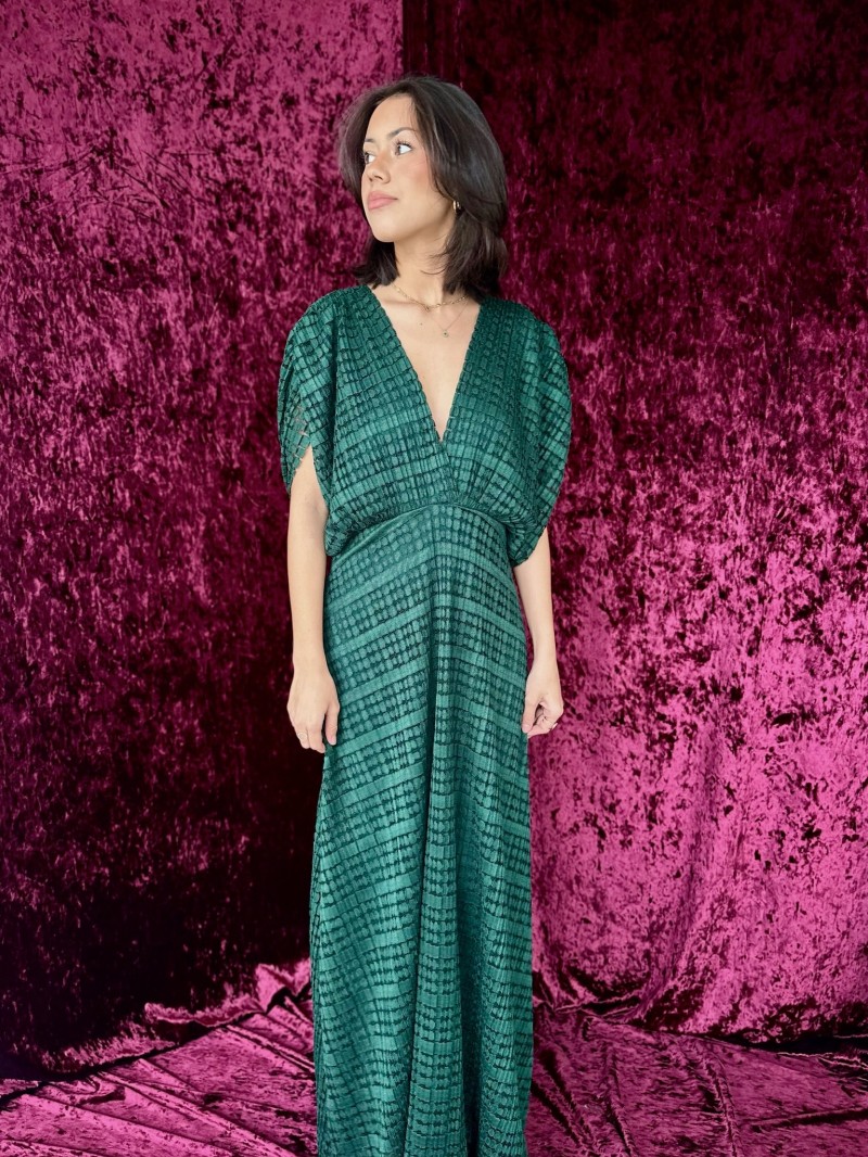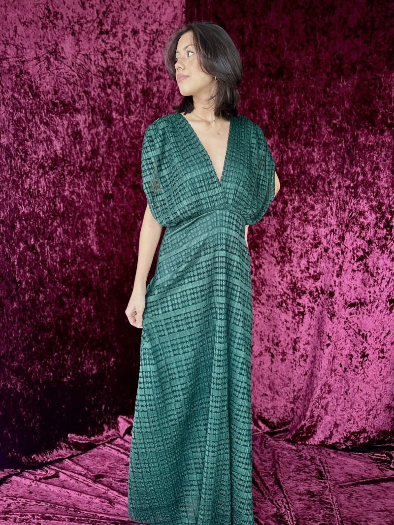 La robe Marianne est une pièce élégante et aérienne, parfaite pour les cérémonies et les soirées. Sa matière texturée ajourée apporte un charme unique tandis que son décolleté croisé et ses manches amples sculptent une silhouette féminine. La taille élastiquée offre un confort idéal et un tombé fluide très chic.