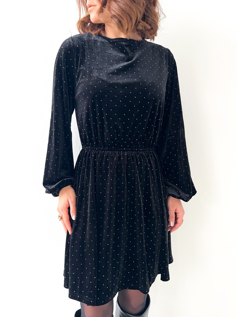 Une robe courte en velours d’une douceur incomparable, ornée de micro-sequences qui accrochent subtilement la lumière. Sa taille élastiquée offre une silhouette élégante et confortable, tandis que son encolure fluide et son dos délicatement ouvert apportent une allure féminine et moderne. Une pièce chic et facile à porter, idéale pour les soirées et les moments festifs.