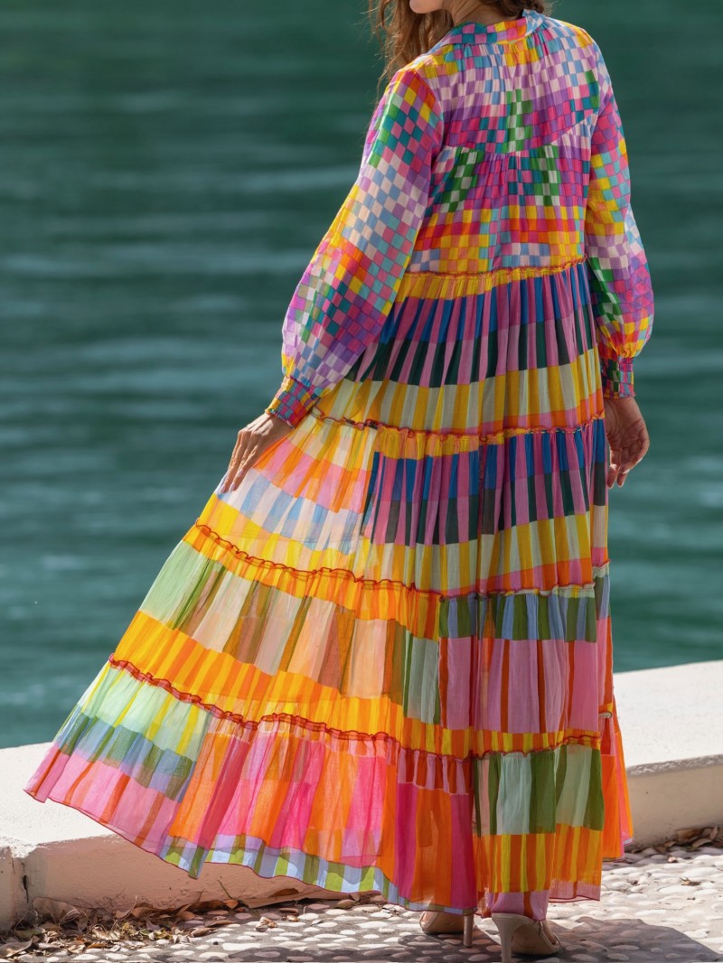 Robe longue fluide au motif coloré et vibrant, parfaite pour une allure bohème et lumineuse. Sa coupe ample et aérienne offre un tombé élégant et un confort absolu.