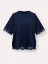 T-shirt au style féminin et délicat, revisité avec des détails en dentelle qui apportent une touche élégante et raffinée. Sa coupe fluide et confortable en fait une pièce facile à porter au quotidien.