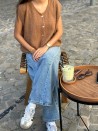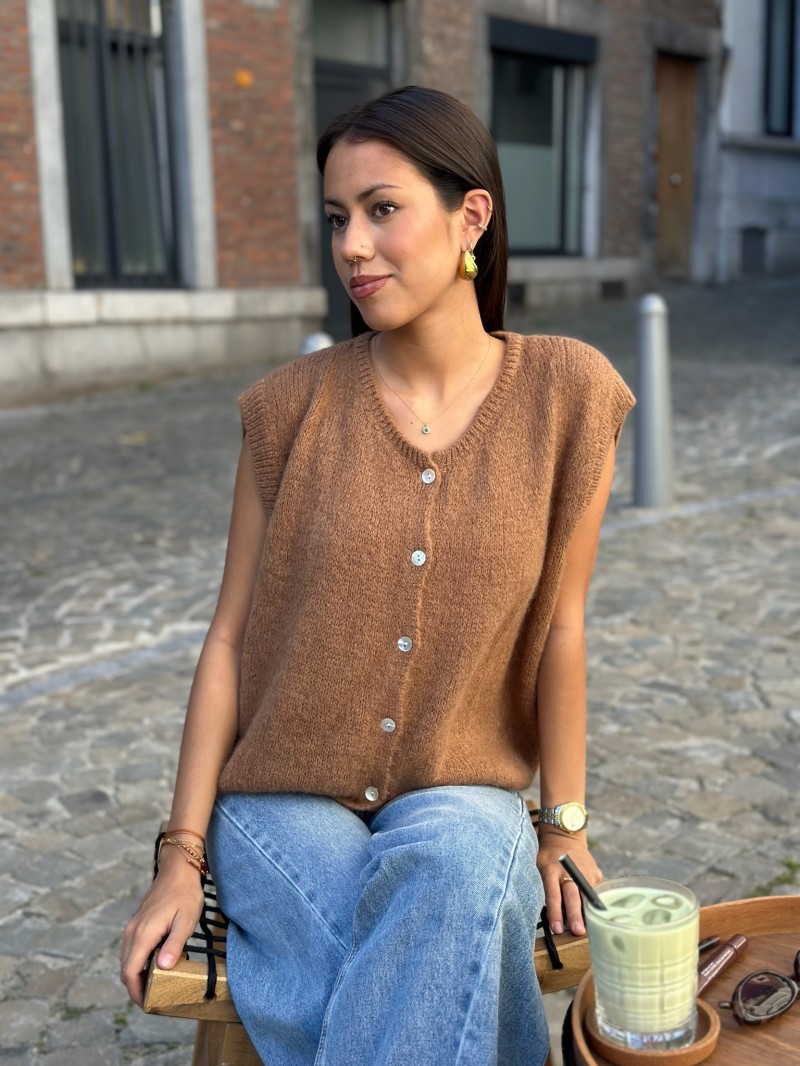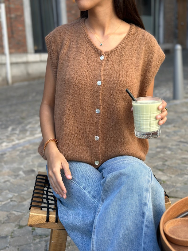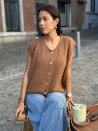 Un gilet tout doux, à la coupe ample et sans manches, avec une boutonnière frontale. Confort et style réunis dans une pièce tendance à porter en superposition ou à même la peau.