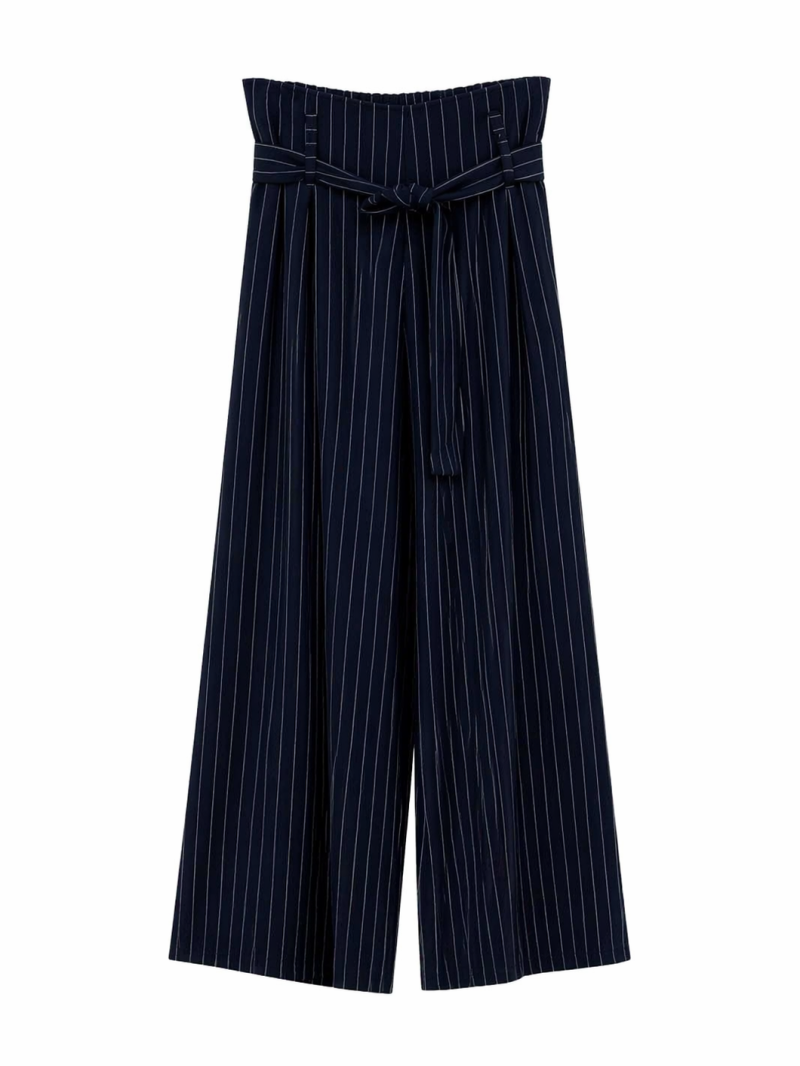 Pantalon long à rayures au tombé fluide et élégant. Sa coupe large allonge la silhouette et apporte une allure sophistiquée, idéale pour une tenue chic et moderne.