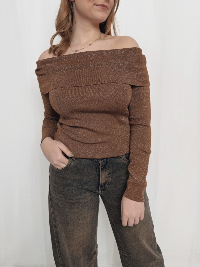 Een stralende, vrouwelijke trui die perfect is voor avondoutfits of alledaagse looks. De off-the-shoulder snit zorgt voor een elegante look, terwijl het licht pailletten breisel een feestelijk tintje toevoegt zonder het te overdrijven. Hij is comfortabel, elastisch en verkrijgbaar in verschillende kleuren die bij elke stijl passen.