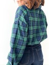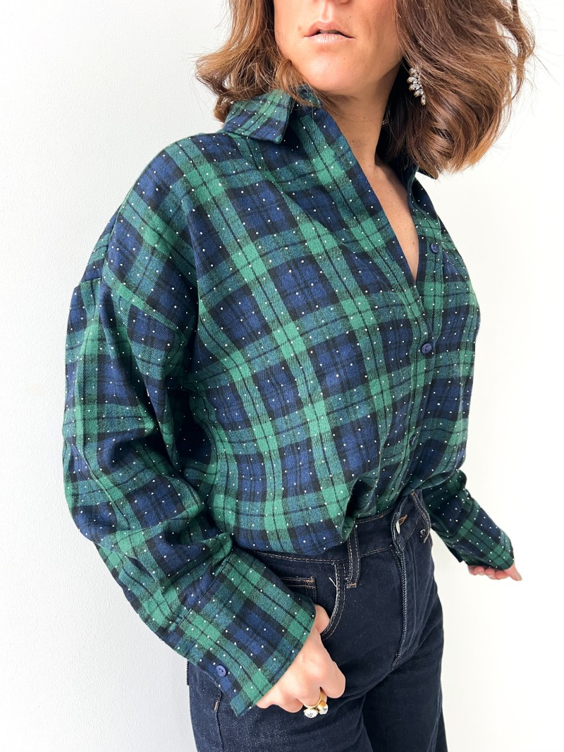Een modern, vloeiend overhemd in een groen en blauw ruitpatroon, met fijne paillettenaccenten voor een trendy look. De lichte, comfortabele snit maakt het ideaal voor een casual maar assertieve stijl.
