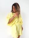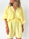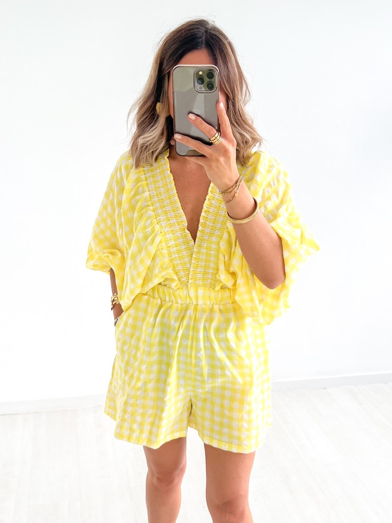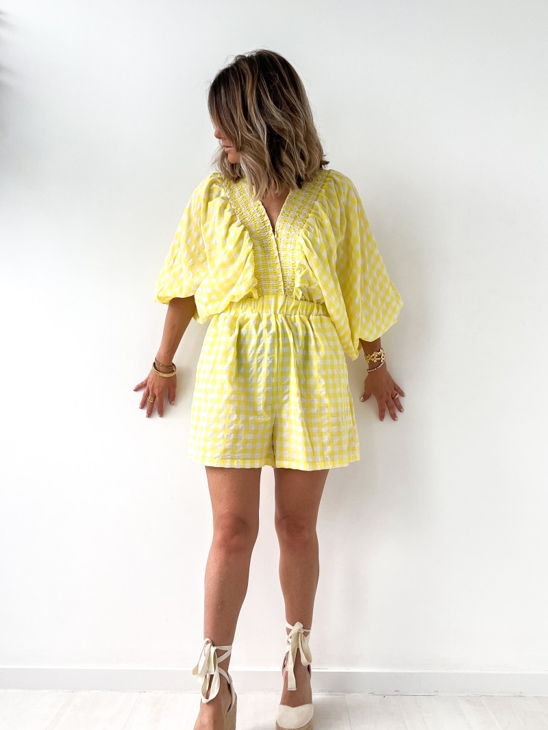 De Marin-jumpsuit valt op door zijn ruitjesmotief en heeft een frisse en heldere stijl. Hij heeft een V-hals met ruches, pofmouwen voor een vleugje elegantie en een elastische taille die zich aanpast aan alle lichaamsvormen. Hij is veelzijdig en gemakkelijk te dragen, perfect voor een ontspannen dag of een zomeravond. Kies voor de Marin-jumpsuit voor een chique en zomerse look!