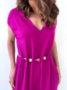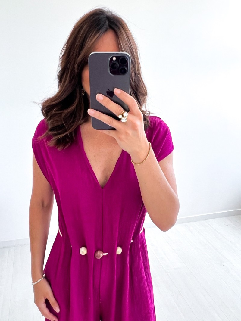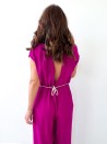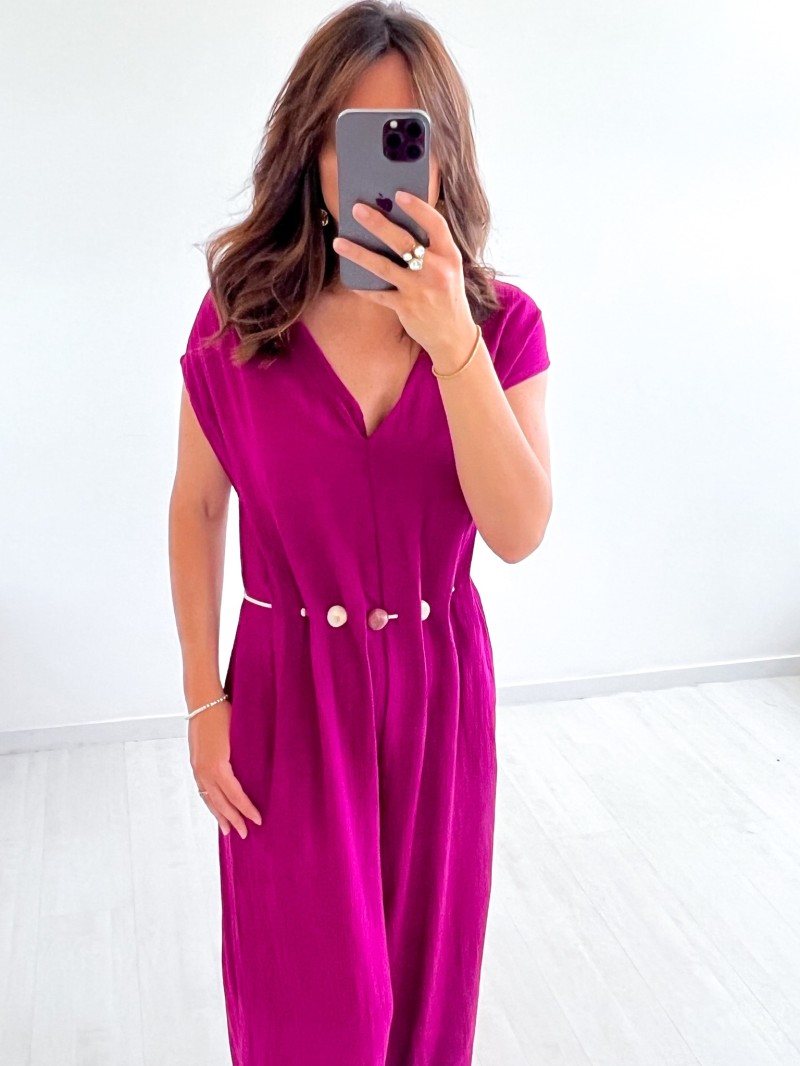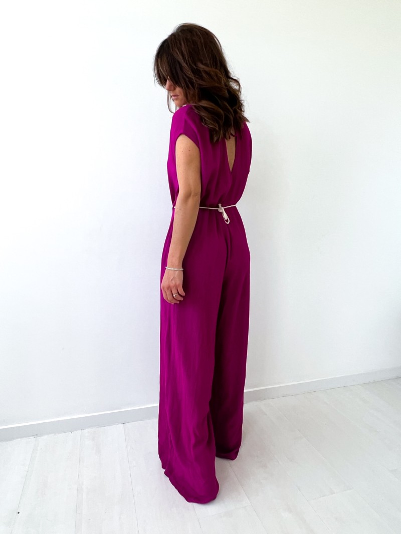 Een lichte, vloeiende jumpsuit met een losse pasvorm, in de taille strakker gemaakt met een verstelbare strik. De V-halslijn aan de voor- en achterkant wordt benadrukt door een koordje en de taille is versierd met mooie natuurstenen.