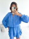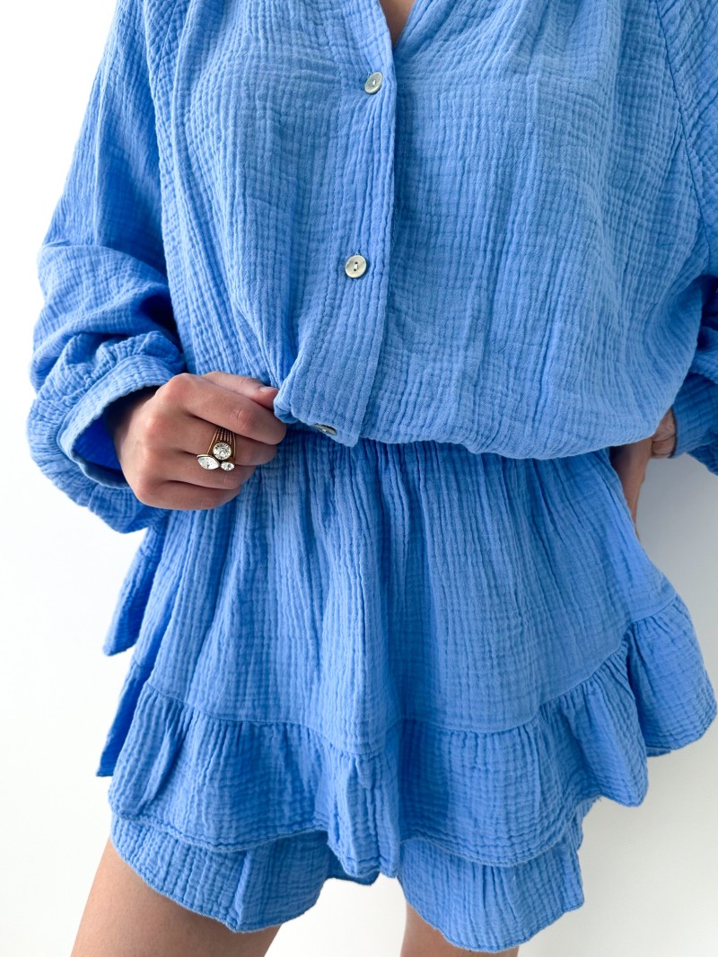 De elegante en uiterst comfortabele Romane-jumpsuit valt op door zijn lichte, gewafelde stof van puur katoen. Lange mouwen met elastische taille en mooie ruches aan de onderkant van de short. Gemakkelijk aan te trekken dankzij de knopen, ideaal voor een vrouwelijke en ontspannen look.