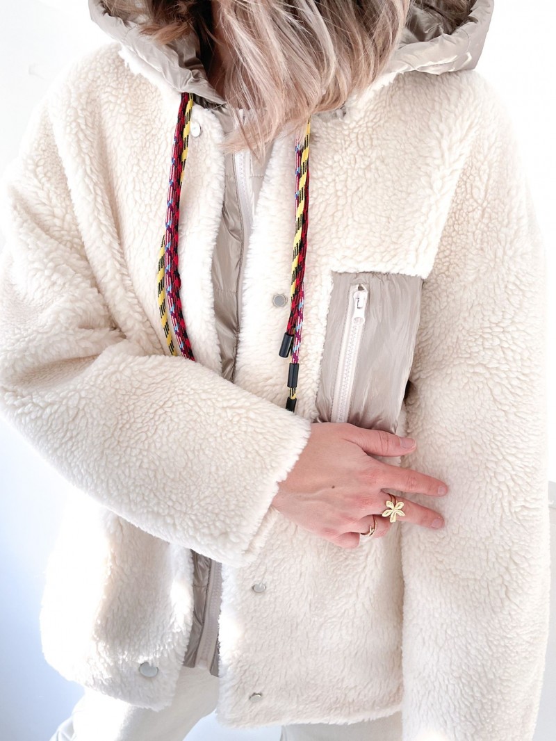 Afneembare gouden capuchon met gekleurde koorden (deze kan worden verwijderd via een ritssluiting aan de binnenkant)
