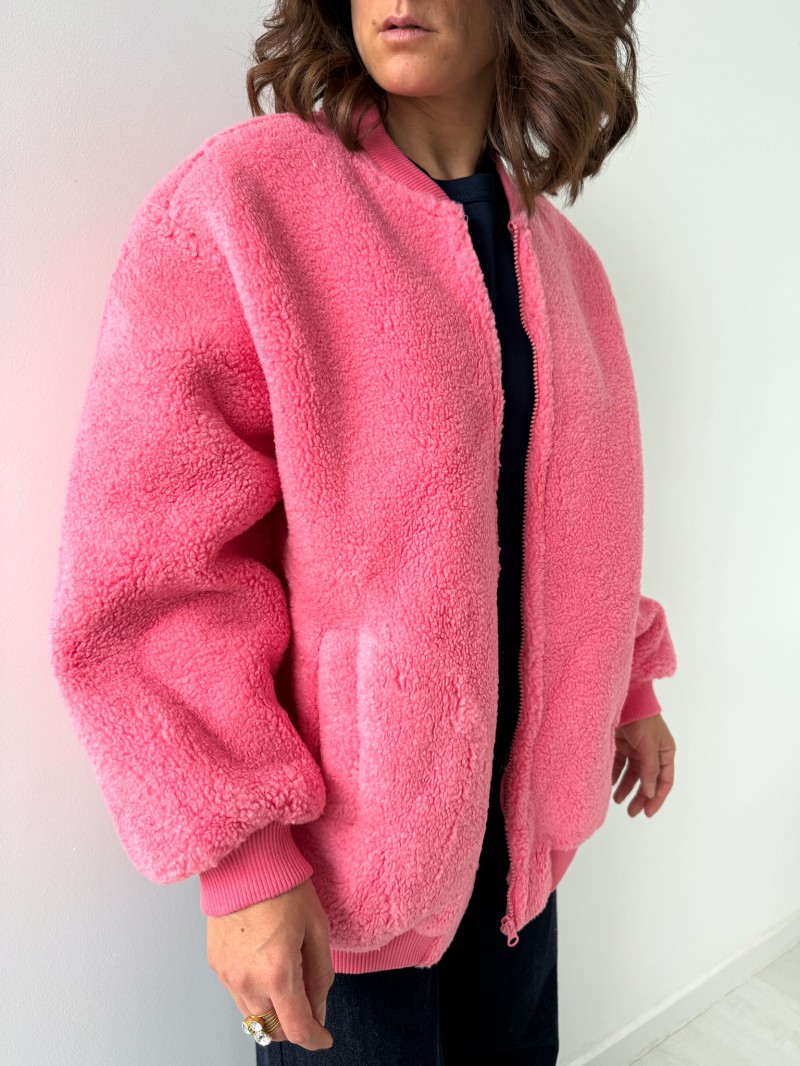 Geef je winterlooks een vrolijke touch met het fleecevest Lola! We zijn dol op de zachte schapenvachttextuur en de stralende roze kleur die je stijl meteen opfleurt. De bomberpasvorm en geribde afwerking zorgen voor een moderne en vrouwelijke look. Perfect voor gezellige dagen thuis of om een casual look een twist te geven.