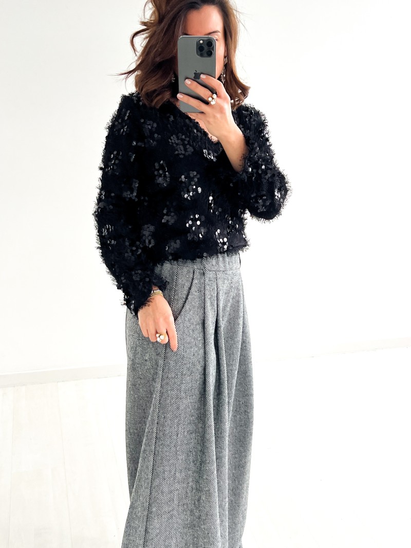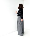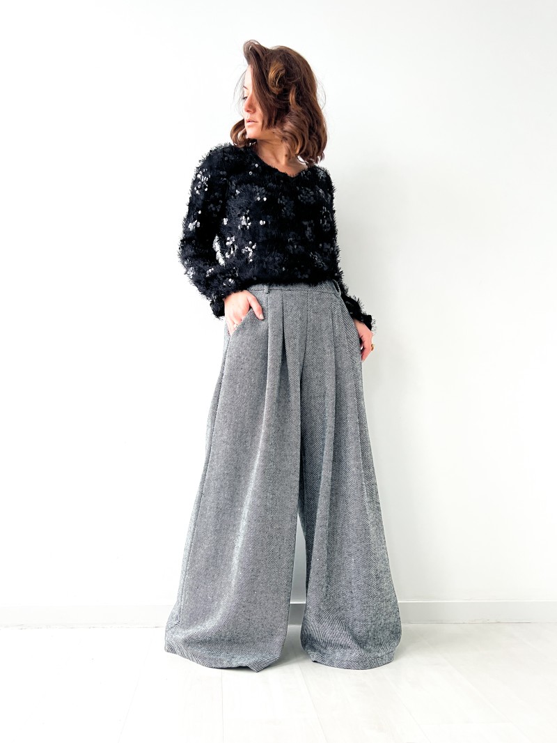 Een wijde, vloeiende broek met een moderne stijl en een zachte, comfortabele stof. De losse pasvorm en elegante snit verlengen het silhouet, terwijl de elastische tailleband een gevoel van absoluut comfort geeft. Een trendy, gemakkelijk te dragen stuk voor moeiteloos chic.
