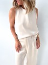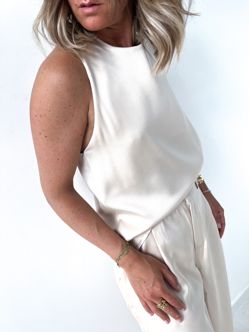 Ontdek elegantie met onze'Blouse Versatile Venezia', gemaakt in Italië. Verkrijgbaar in blauwzwart, champagne, marineblauw, salie, lichtroze en roestbruin, combineert deze blouse duurzaam comfort met een soepele pasvorm dankzij het 100% polyester materiaal. De hoge kraag en mouwloze ontwerp maken dit een verfijnd en veelzijdig kledingstuk, ideaal voor elke gelegenheid.