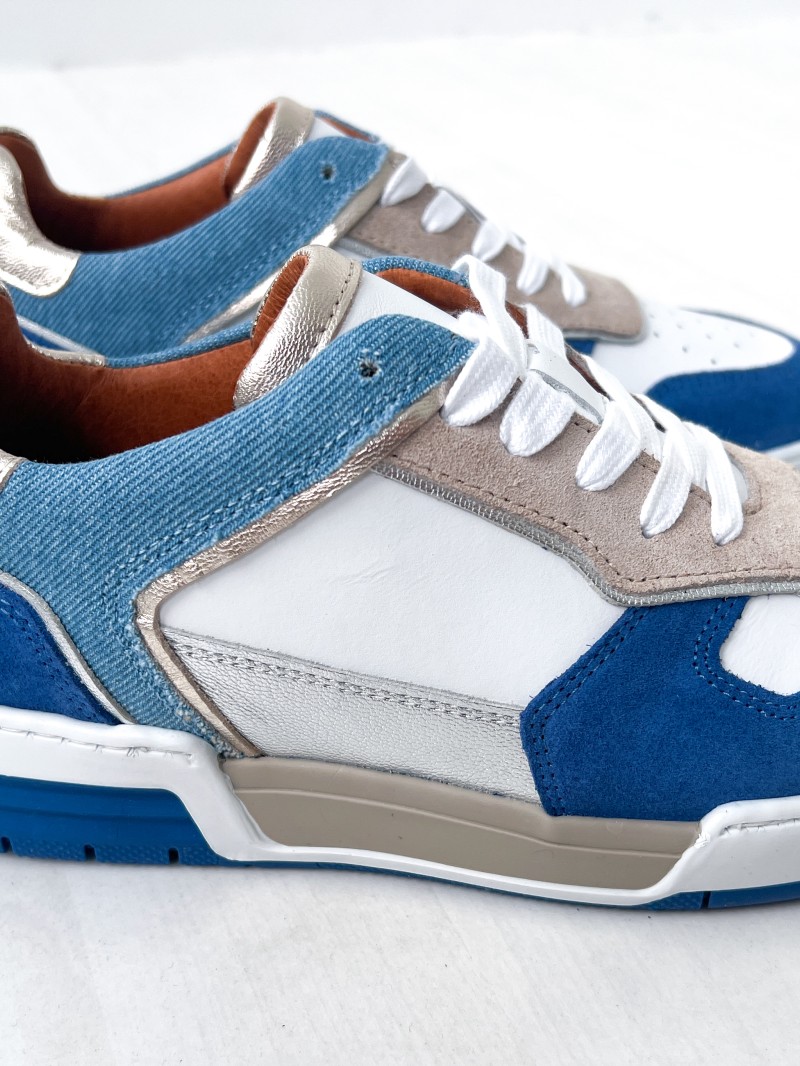 Materiaal: leer aan de binnenkant, leer en denim aan de buitenkant