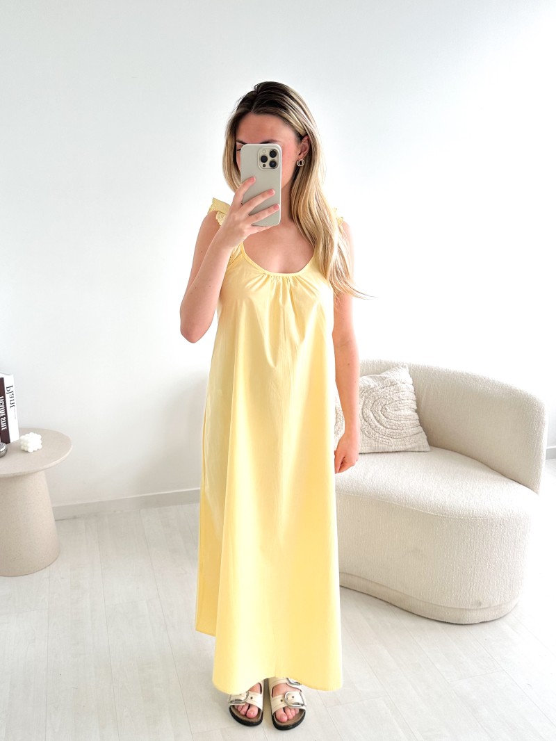 Een stralend en ultra-vrouwelijk model verkrijgbaar in fuchsia of geel, perfect voor zomerse dagen. De Solea-jurk valt op door zijn soepele snit, het materiaal van 100% katoen en de bandjes met Engelse borduursels.