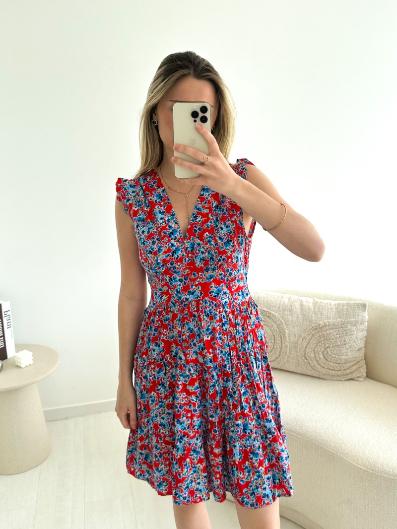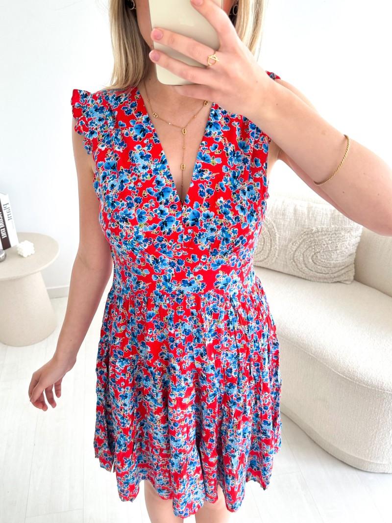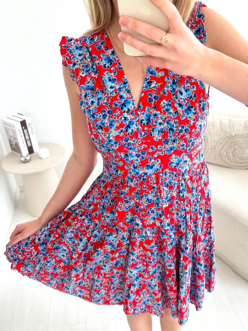 De Lisa-jurk is een fris en charmant kledingstuk, ideaal voor zonnige dagen. De rode en blauwe bloemenprint laat je teint meteen stralen en geeft je garderobe een vrolijke toets. Met zijn mooie V-hals, kleine mouwtjes met ruches en soepele skaterpasvorm flatteert hij elk figuur op een vrouwelijke manier.