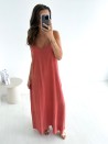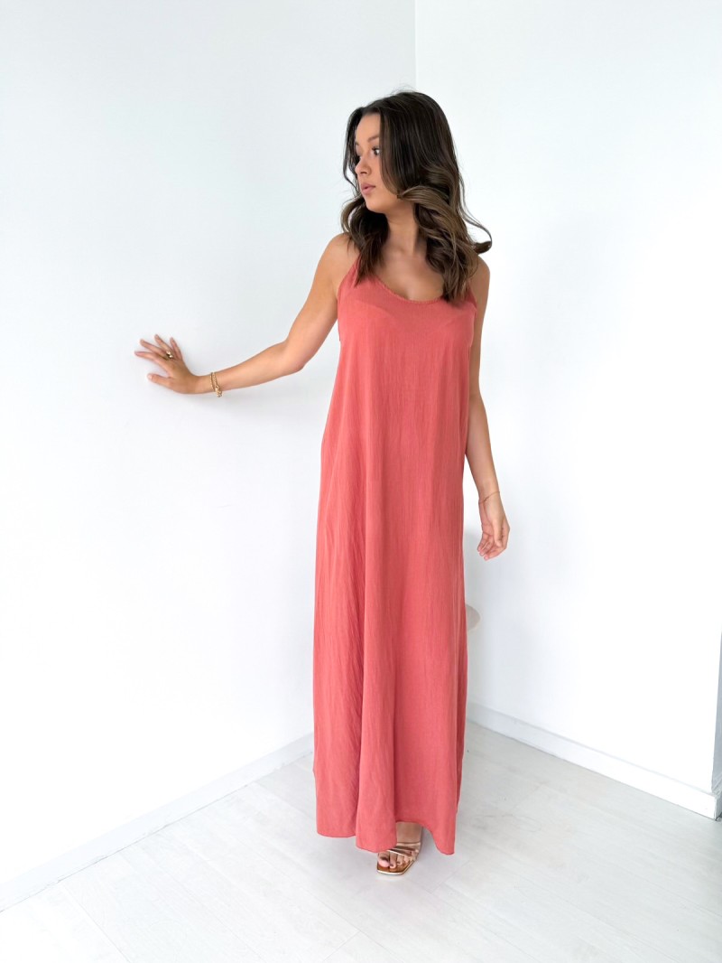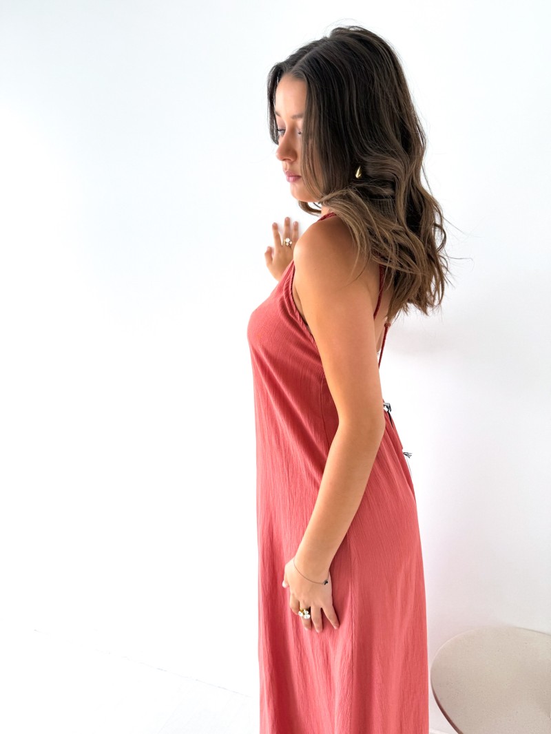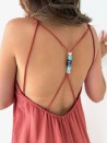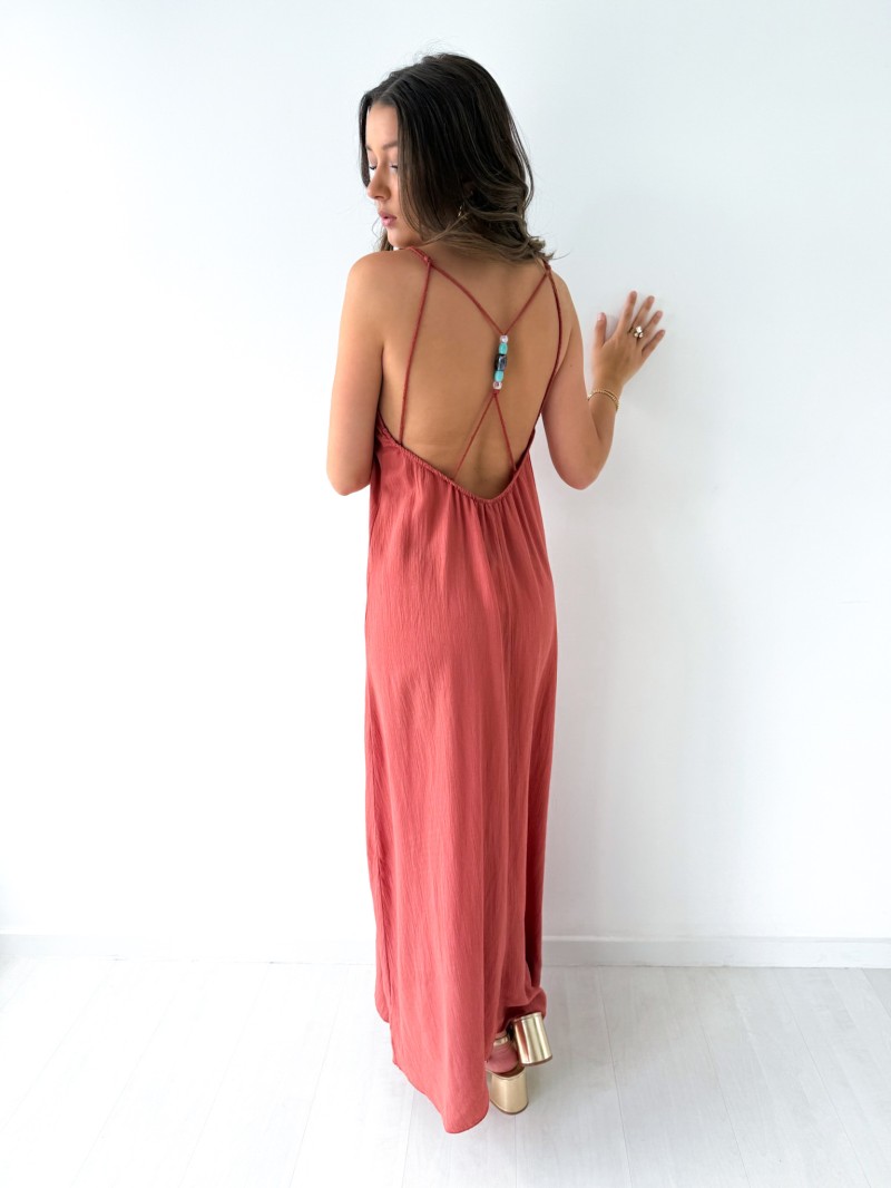 Een lichte, vloeiende jurk met dunne bandjes en een subliem detail op de rug: kriskrasbandjes versierd met decoratieve parels.