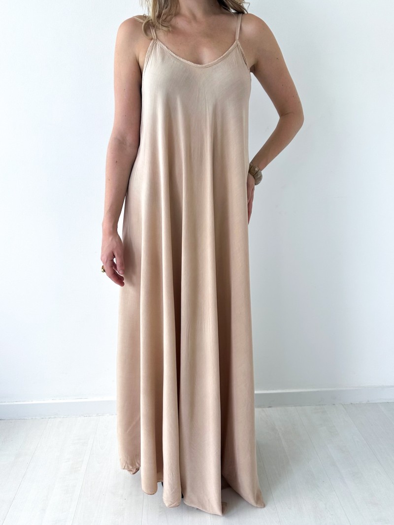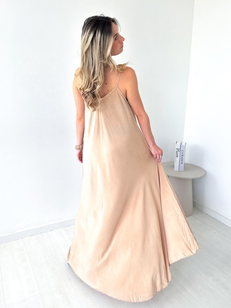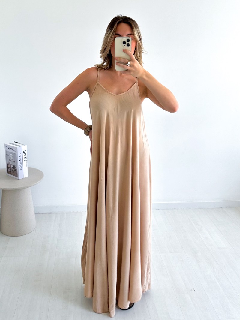 De Olivia-jurk is soepel, elegant en luchtig en onmisbaar voor zonnige dagen. De ruime en lichte snit volgt je bewegingen gracieus, terwijl de dunne bandjes een vrouwelijke en zomerse toets geven. Perfect voor een chique, ontspannen look, zowel op vakantie als in de stad.