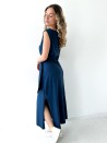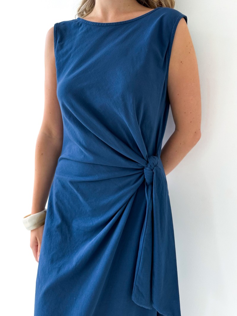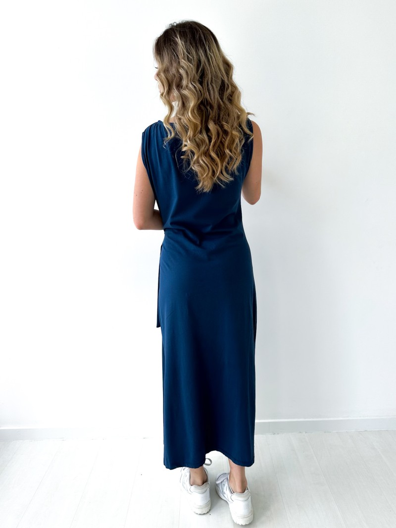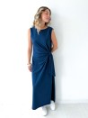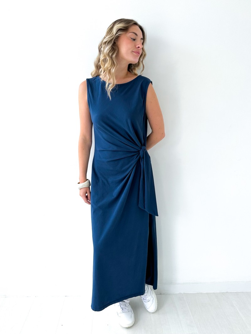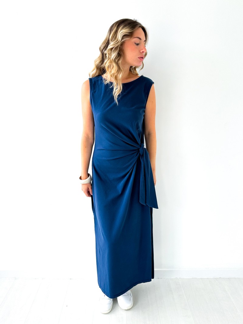 Een elegante, soepel vallende lange jurk met een gestikte strik aan de zijkant die het silhouet accentueert. De zachte, rekbare stof zorgt ervoor dat de jurk comfortabel zit en zorgt voor een casual en verzorgde look.